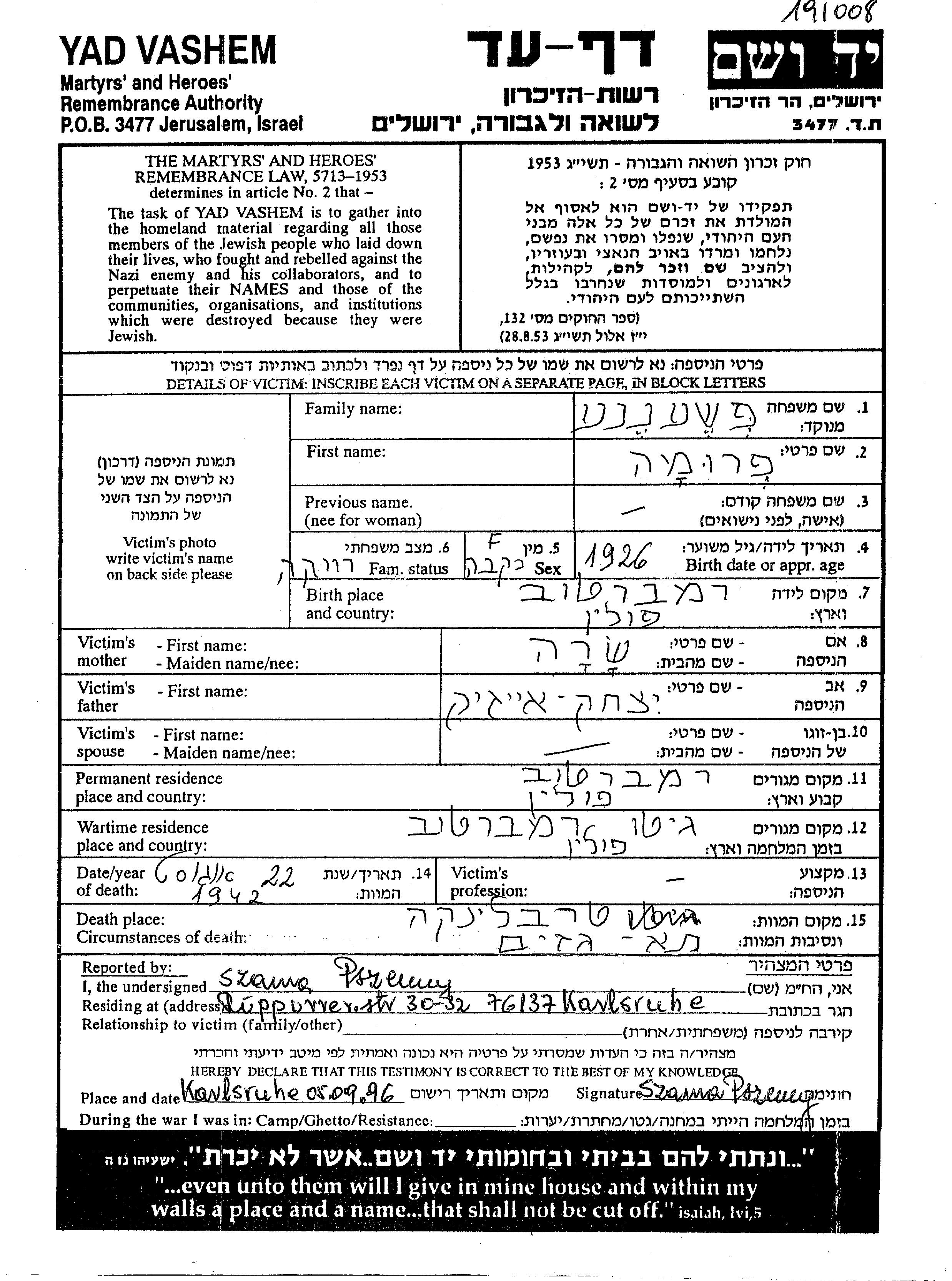 Pszenni Frimet 1925 Rembertow, Poland Page of Testimony