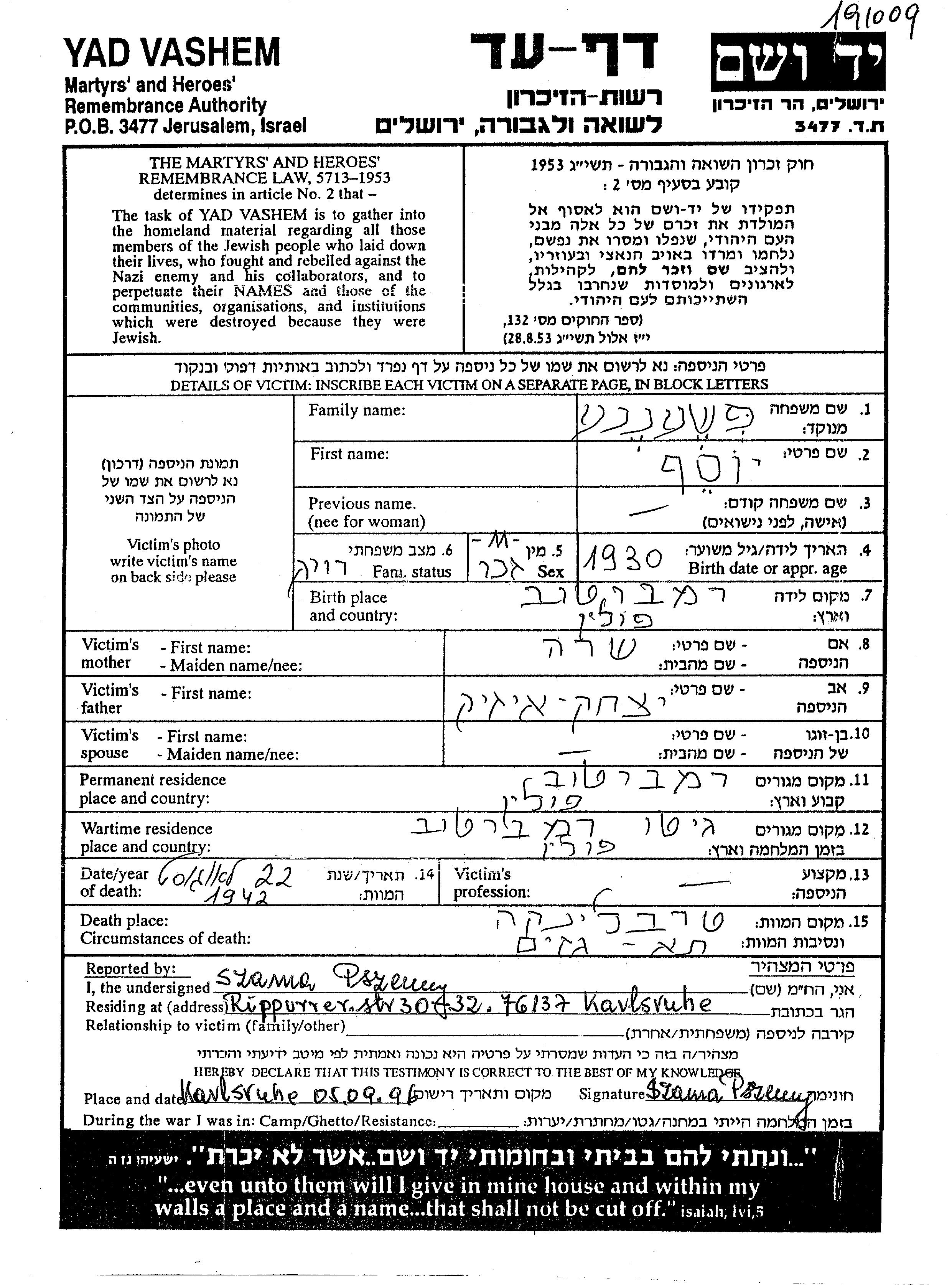 Pszenni Yosef 1930 Rembertow, Poland Page of Testimony
