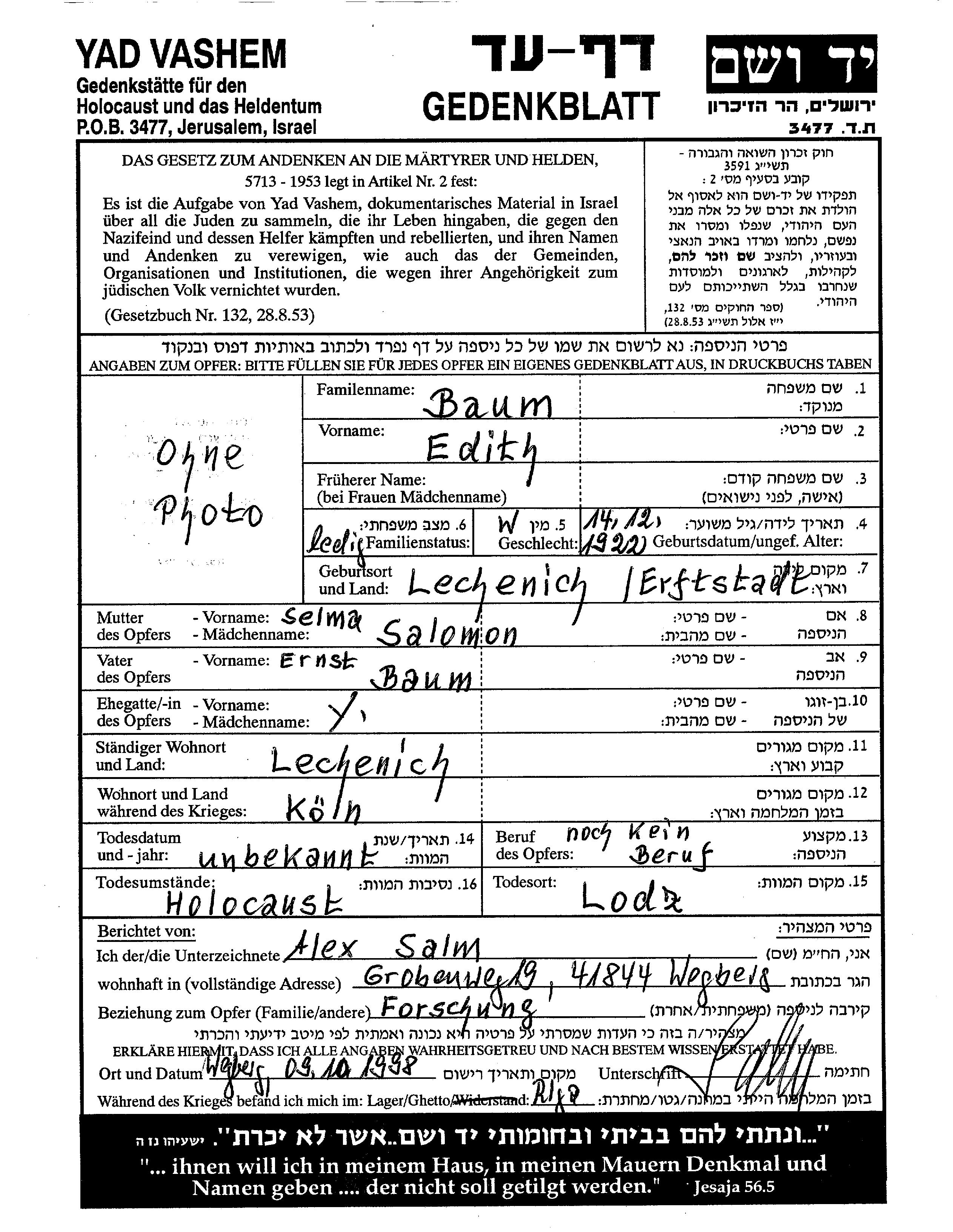 Baum Edith 1922 Lechenich, Germany Page of Testimony