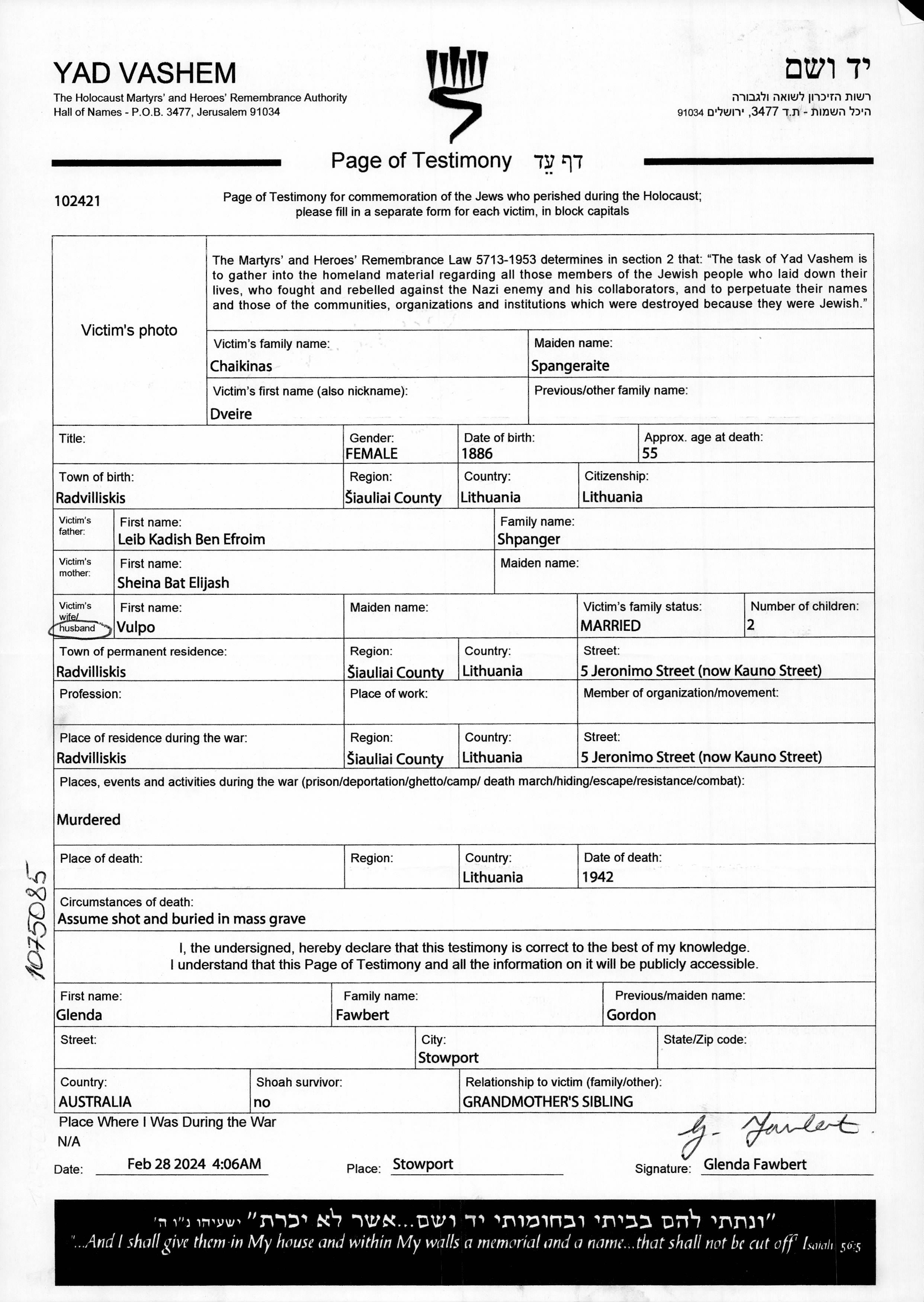 Chaikinas Dveire 1886 Radviliškis, Lithuania Page of Testimony (digital signed)