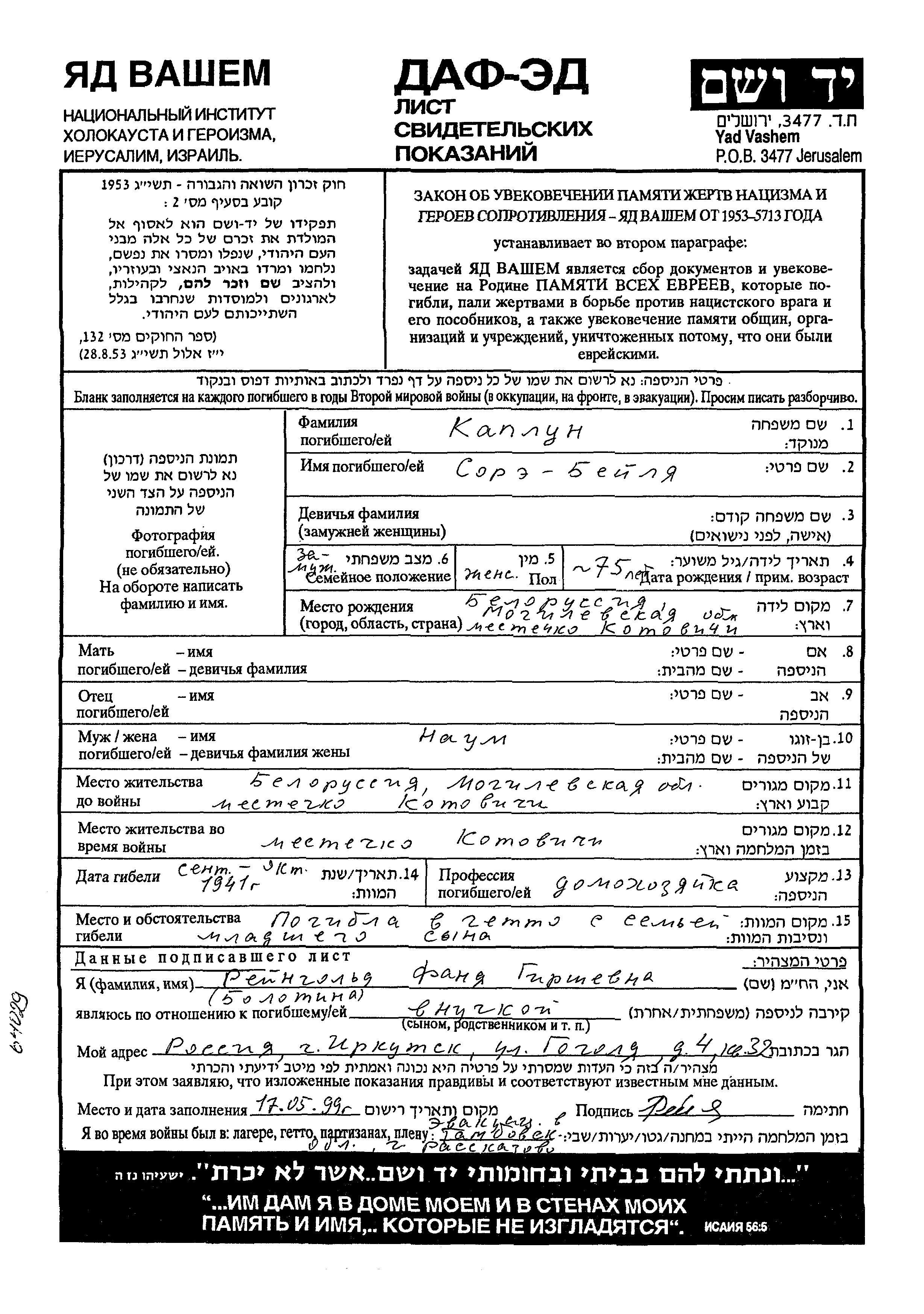 Sore Beilya Kaplun was born in Khotovichi, Belorussia (USSR). She was a housewife. Prior to WWII she lived in Khotovichi, Belorussia (USSR). Sore Beilya was murdered in the Shoah. Place of death: Khotovichi, Belorussia (USSR), 1941.