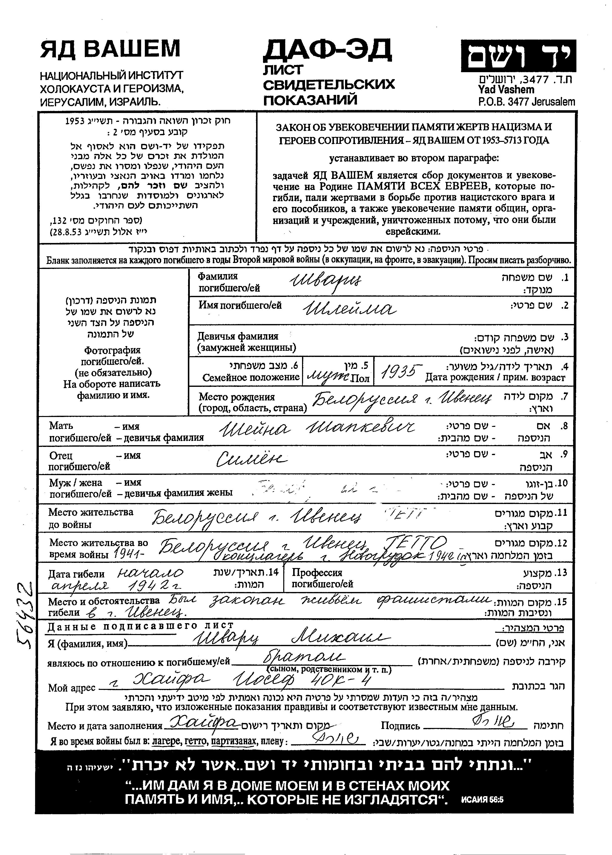 Shvartz Shleima 1935 Ivenets, Poland Page of Testimony