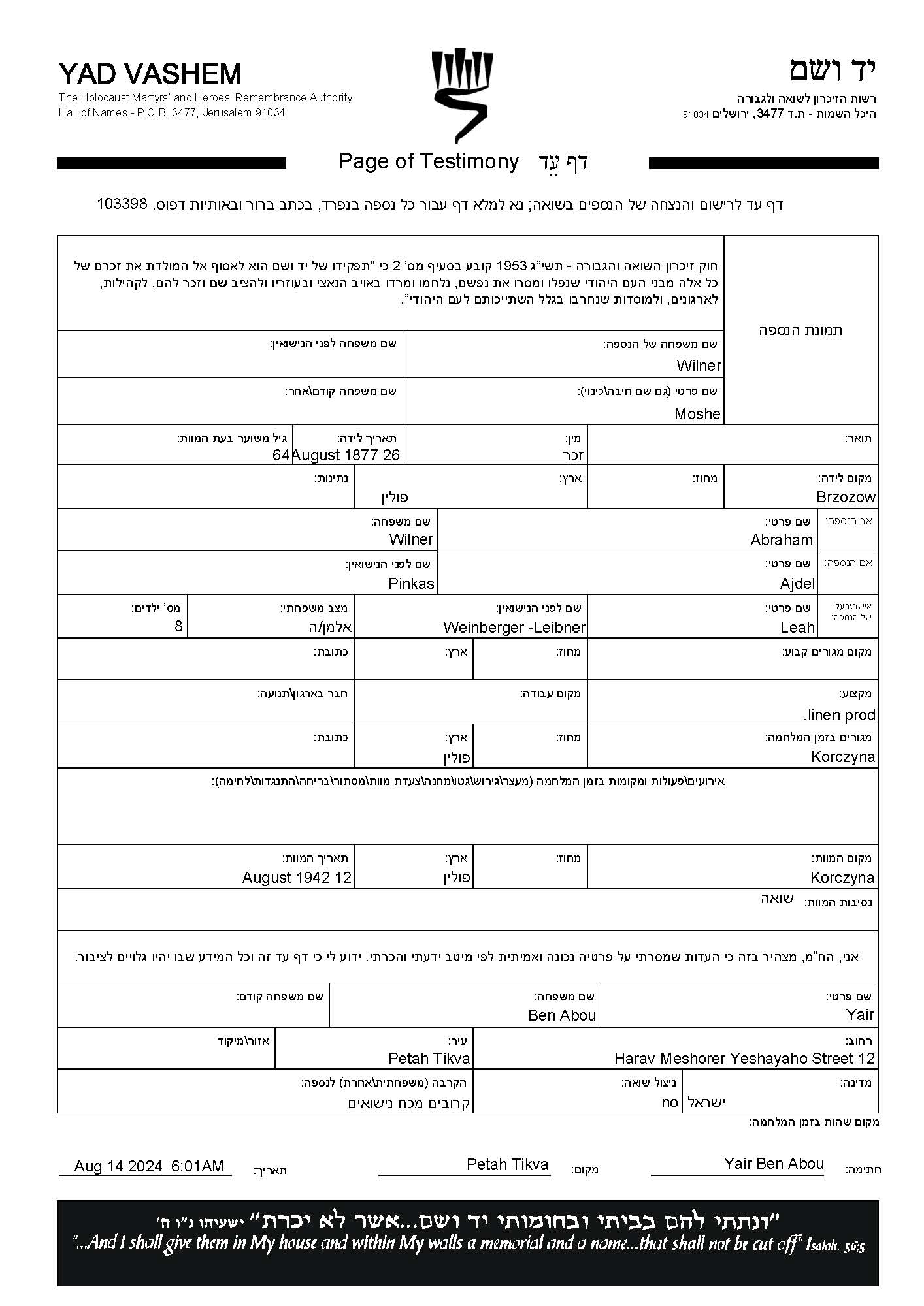 Moshe Wilner was born in Brzozow, Poland, 1877 to Abraham and Ajdel nee Pinkas. He was a linen production and a widowed Leah nee Weinberger Leibner. During the war he was in Korczyna, Poland. Moshe was murdered in the Shoah. Place of death: Korczyna, Poland, 12/08/1942.