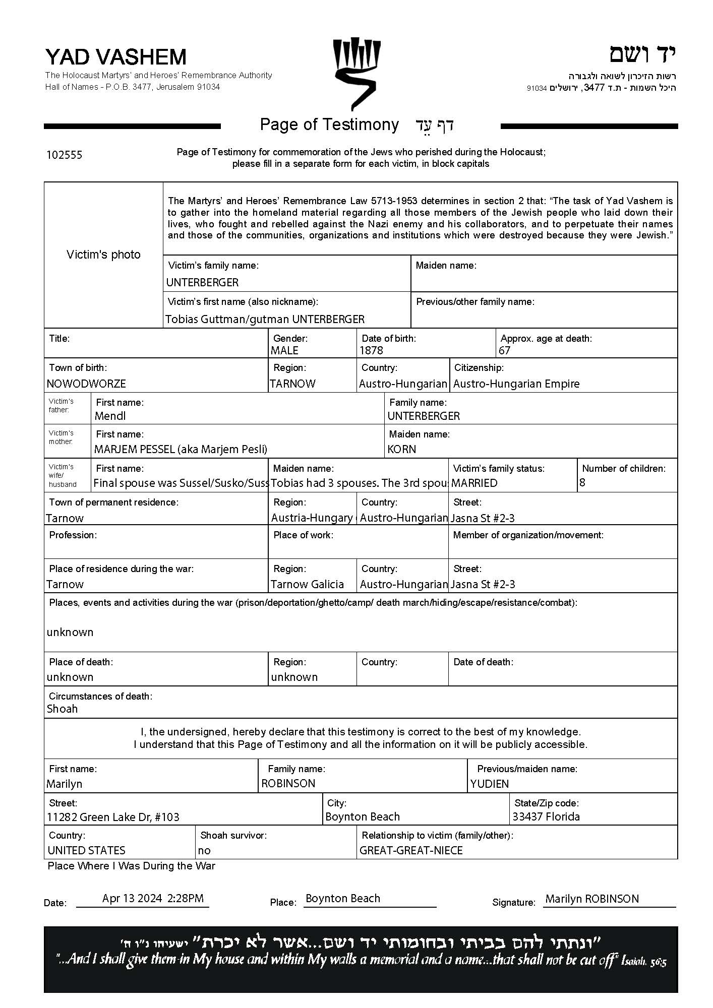 Tobias Guttman Unterberger was born in Undeciphered Place, Poland, 1878. Prior to WWII he lived in Tarnow, Poland. Tobias Guttman was murdered in the Shoah. Place of death: unstated place.