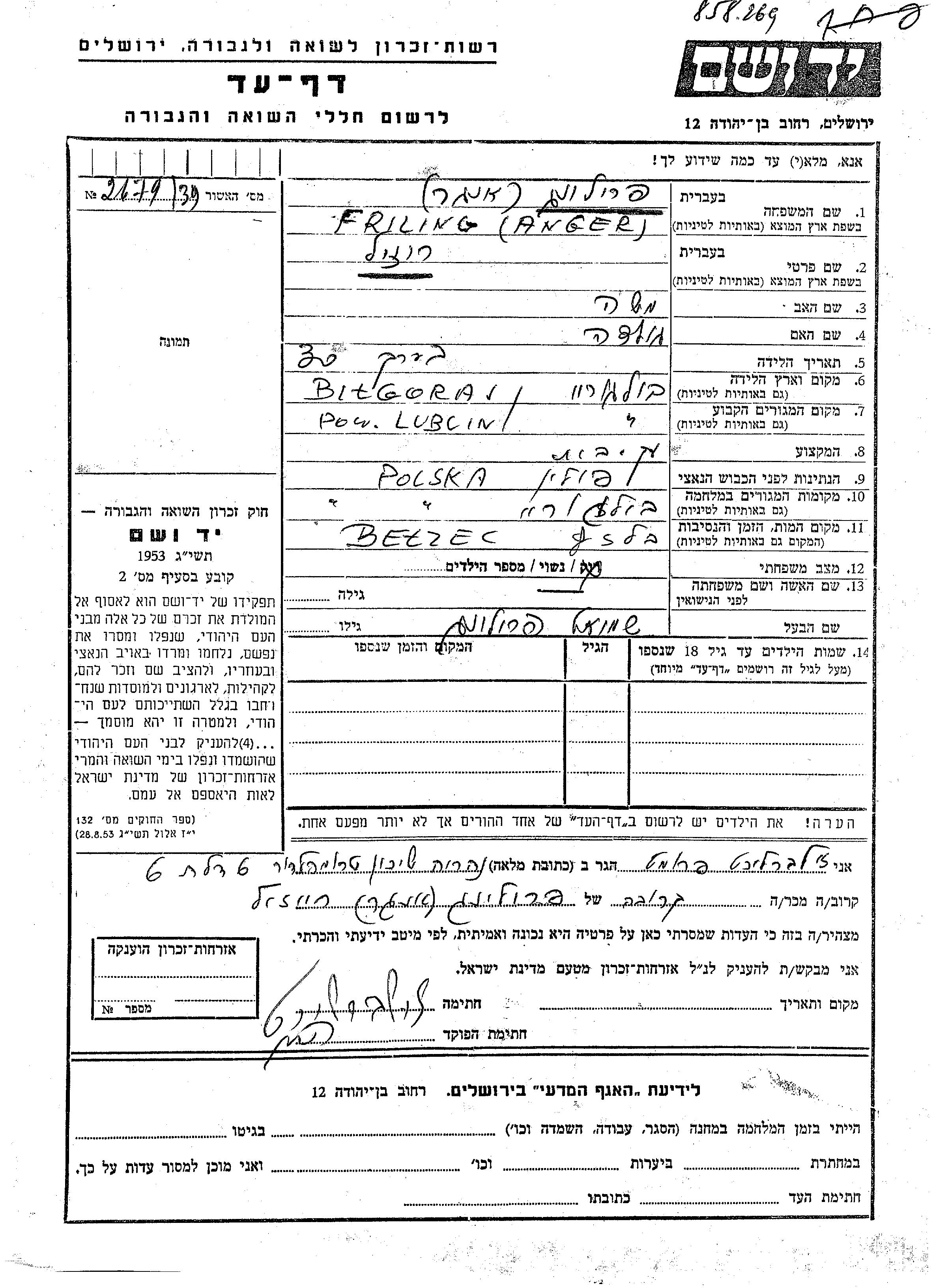 Friling Rozil Bilgoray, Poland Page of Testimony