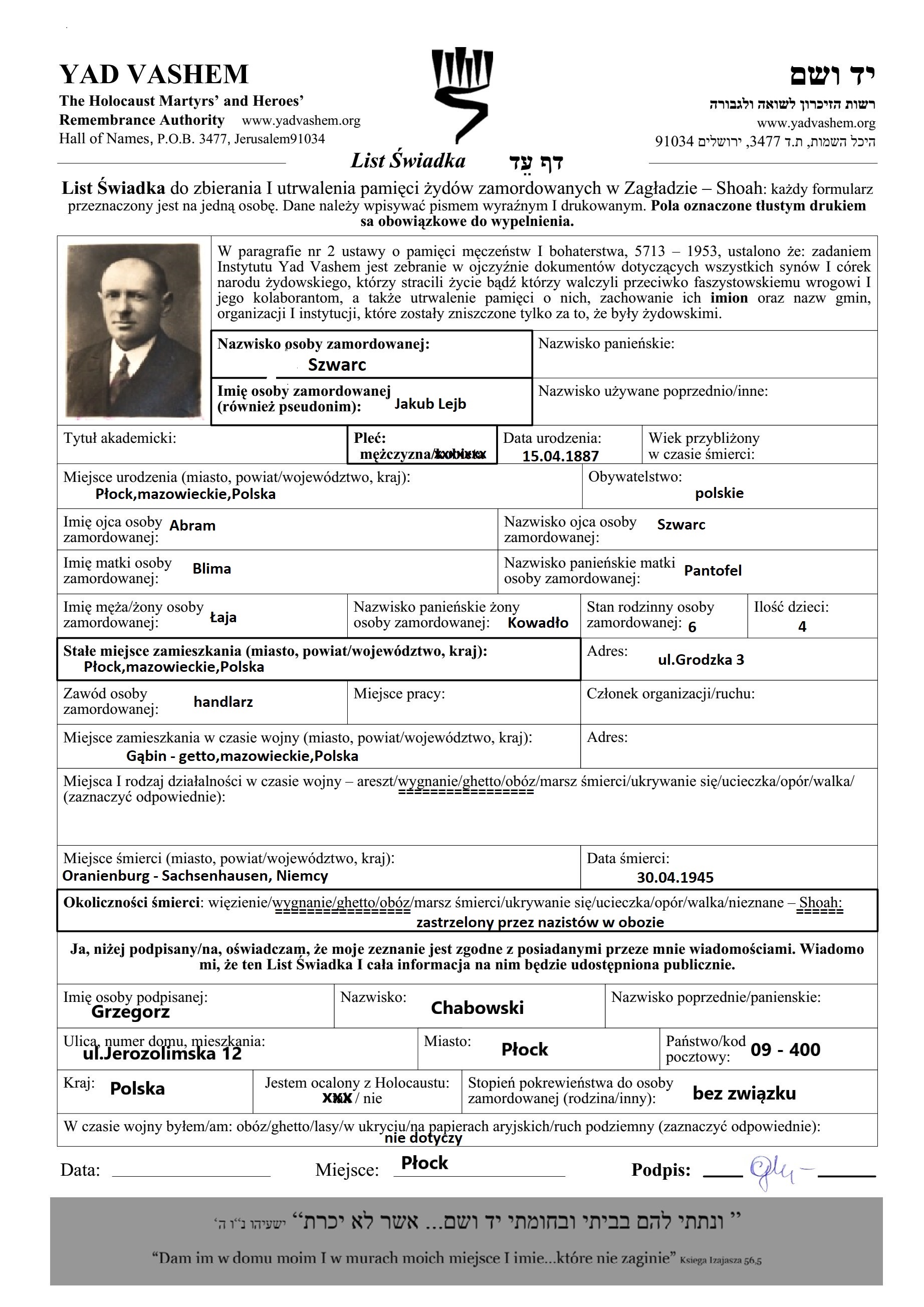 Szwarc Jakub Lejb 1887 Plock, Poland Page of Testimony