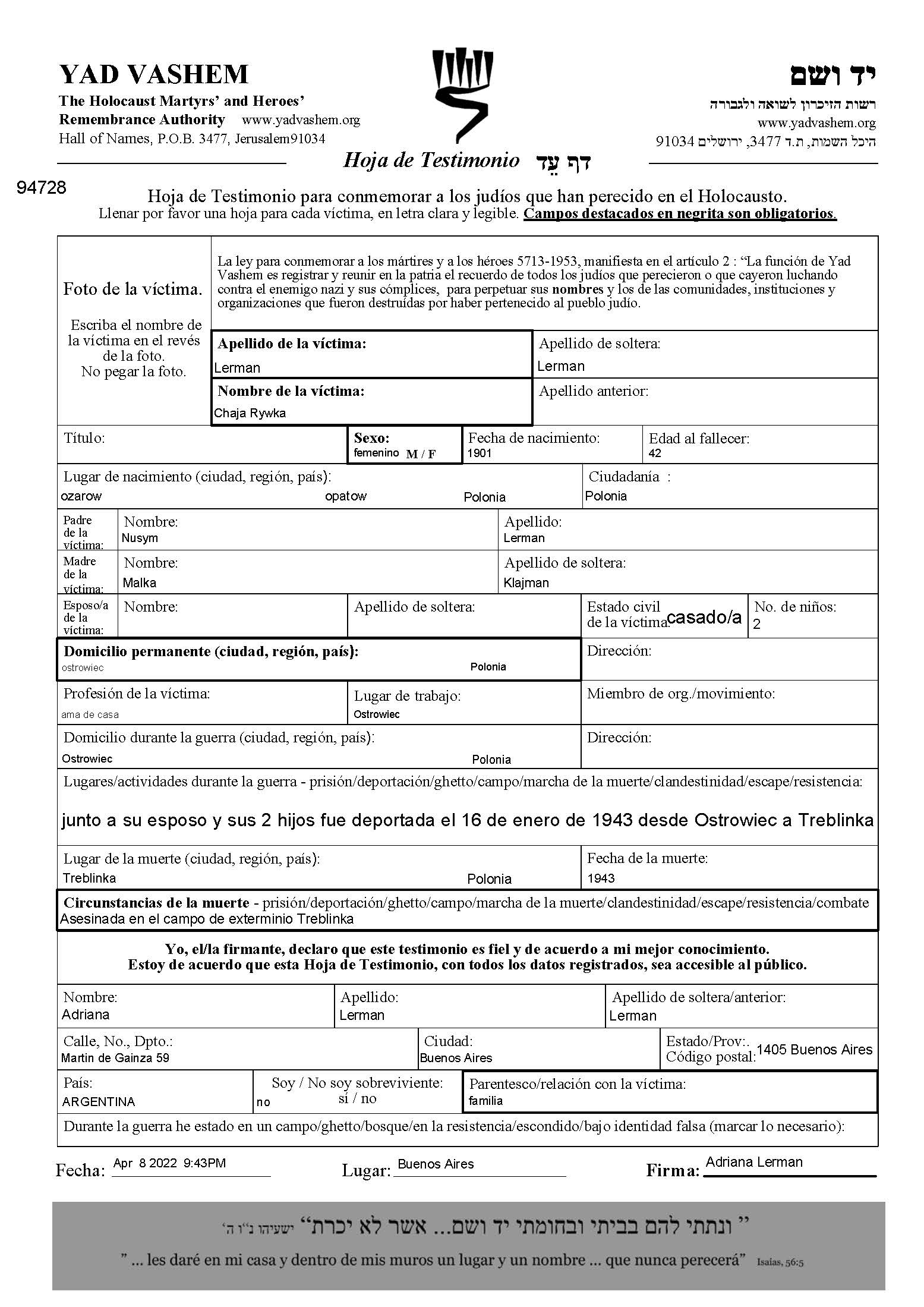 | Lerman | Chaja Rywka | 1901 | Ostrowiec, Poland | Page of Testimony (digital) |