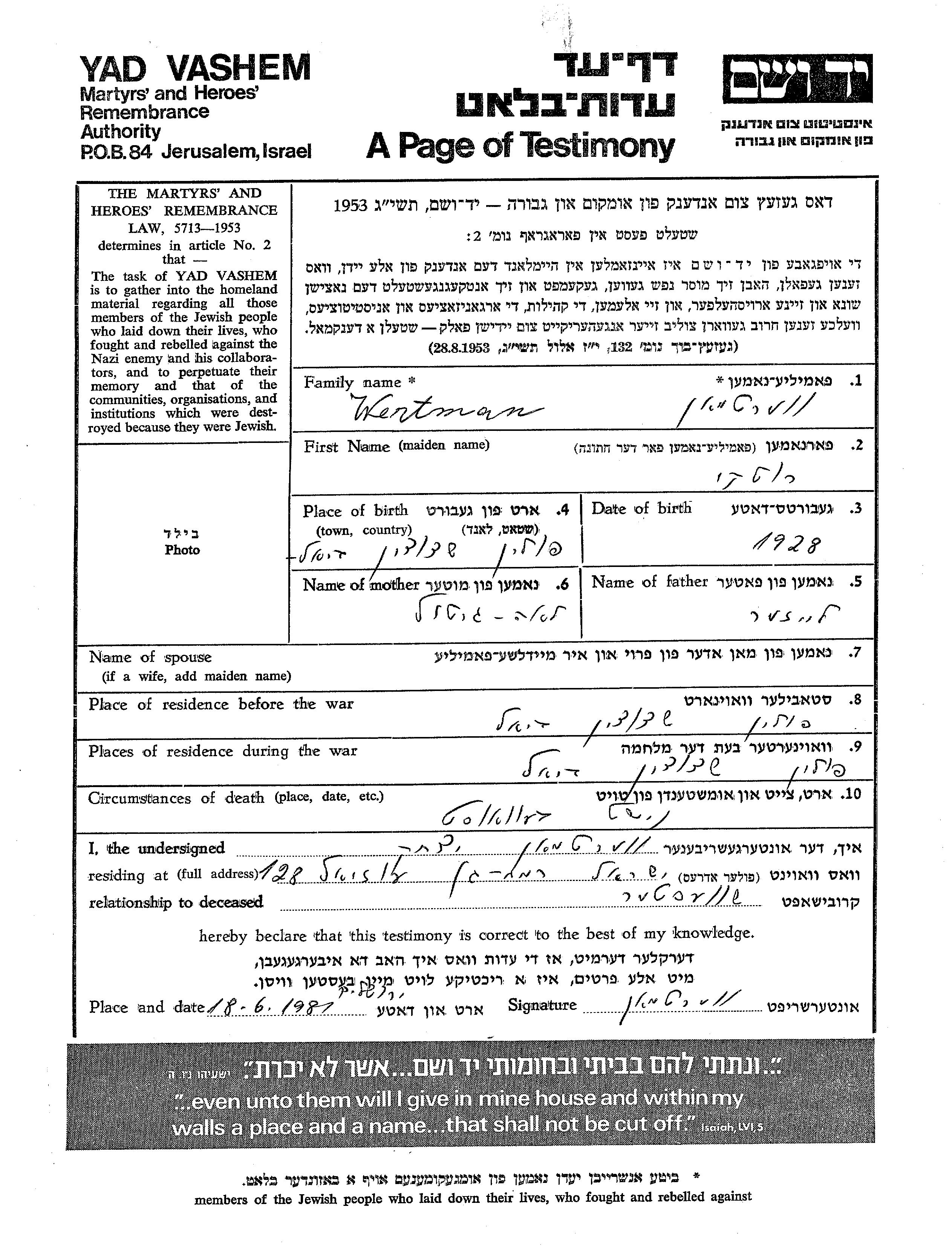 Yad Vashem - Pages of Testimony Names Memorial Collection