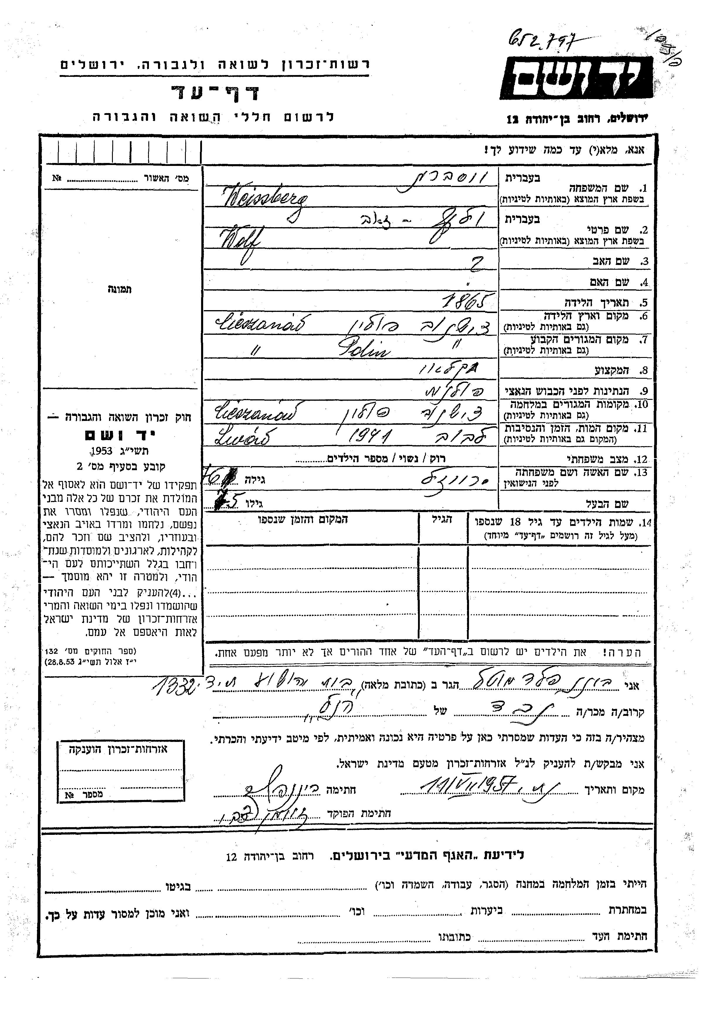 | Weissberg | Wolf Zeev | 1869 | Cieszanow, Poland | Page of Testimony |