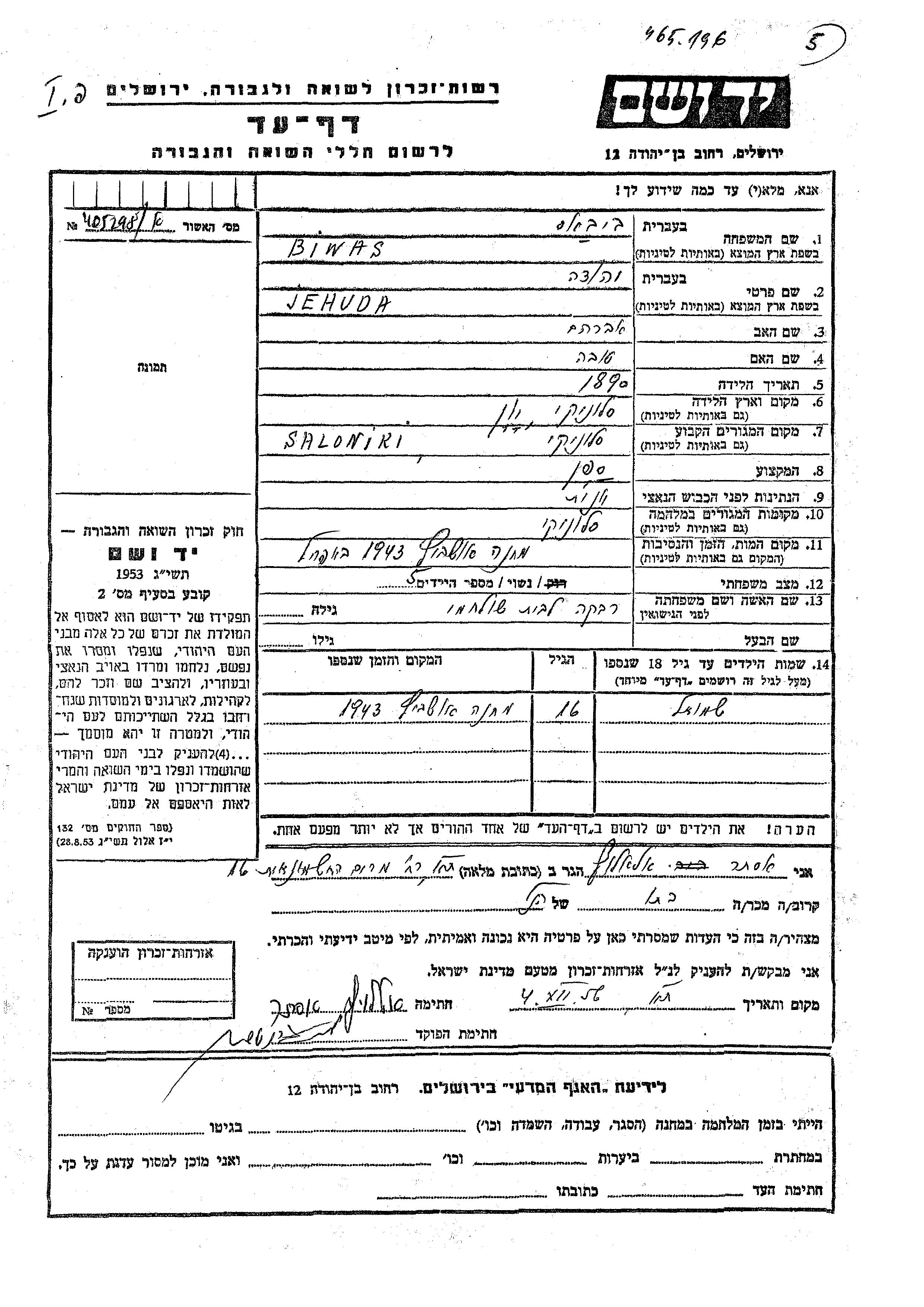 Yehuda Bibas was born in Saloniki, Greece, 1878. He was a sailor. Prior to WWII he lived in Saloniki, Greece.
