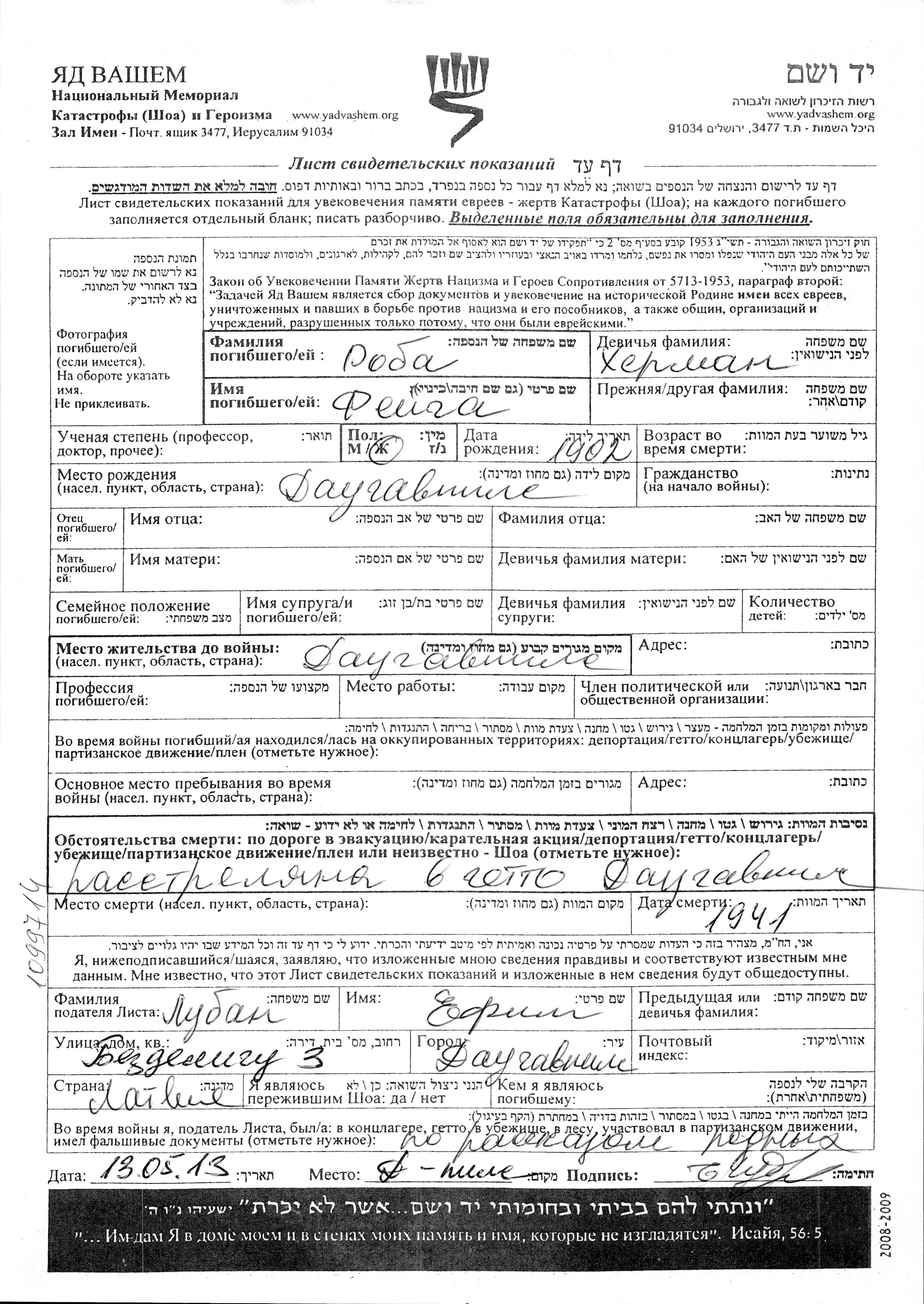 Feyga Doba nee Herman was born in Daugavpils, Latvia, 1902. Prior to WWII she lived in Daugavpils, Latvia. During the war she was in Daugavpils, Latvia. Feyga was murdered in the Shoah. Place of death: Daugavpils, Latvia, 1941.