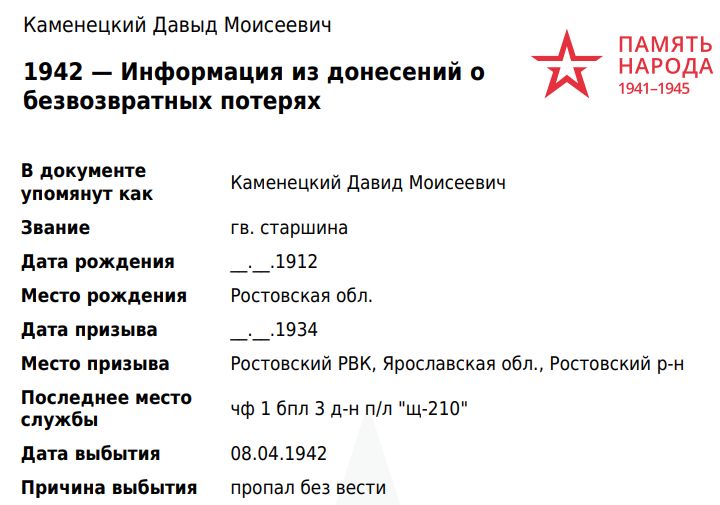 David Kamenetzkiy was born in Rostov, Russia (USSR), 1912. He was a sailor. Prior to WWII he lived in Sevastopol, Russia (USSR). David was killed in military service in WWII. Place of death: Black Sea, 08/04/1942.