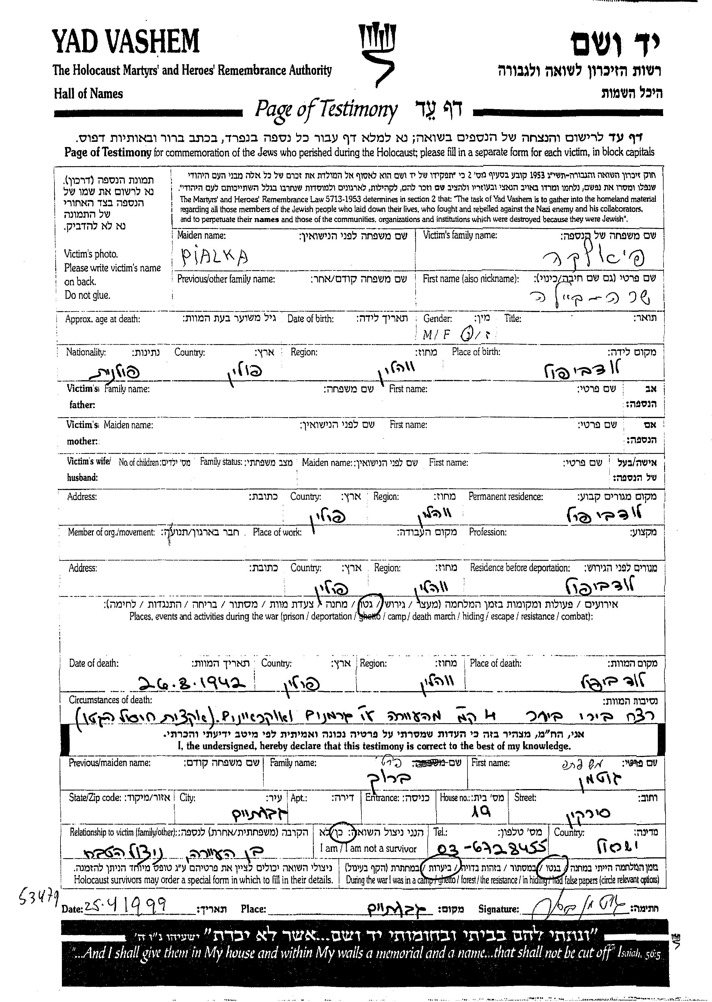 Yad Vashem - Pages of Testimony Names Memorial Collection