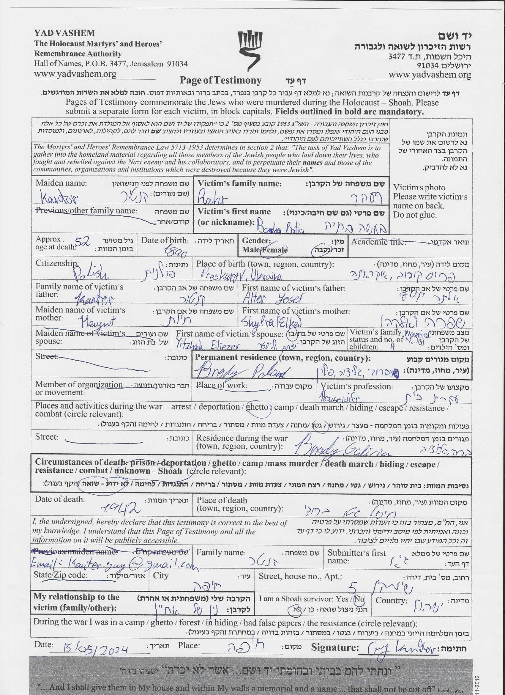 Roer Basha 1890 Brody, Poland Page of Testimony