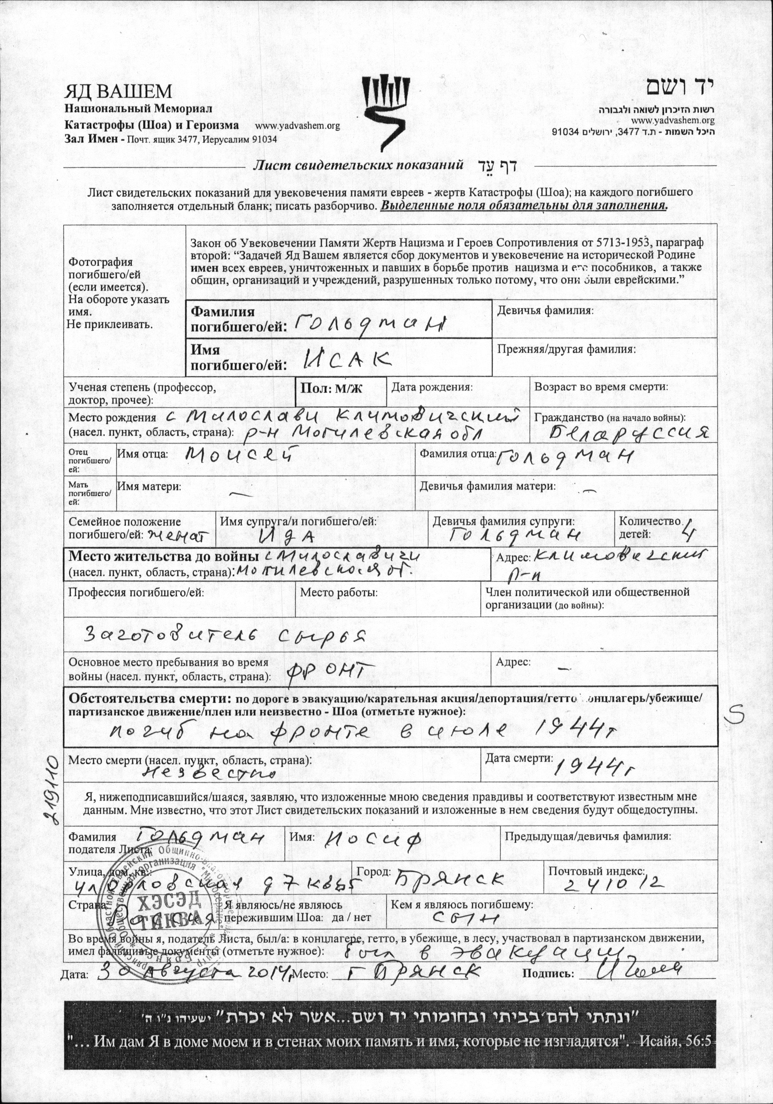 Goldman Iosif Miloslavichi, Belorussia (USSR) Page of Testimony