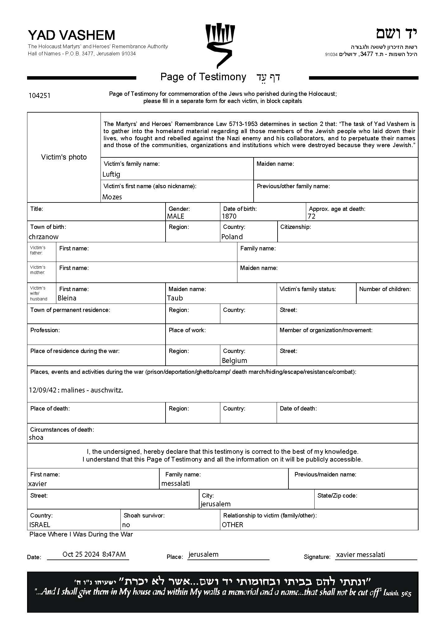 Luftig Mozes 1870 Chrzanow, Poland Deportation list
