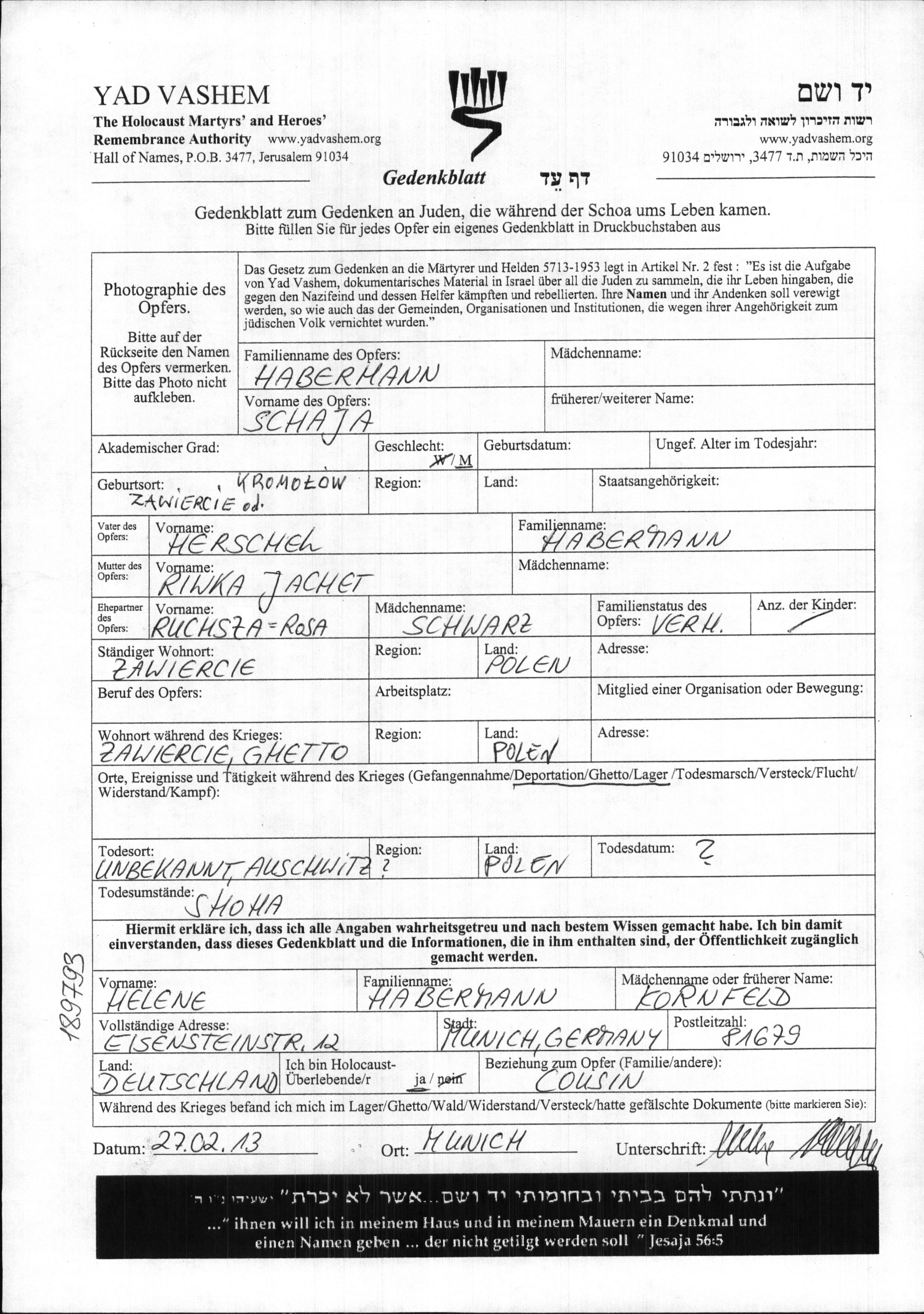 Habermann Schaja Zawiercie, Poland Page of Testimony