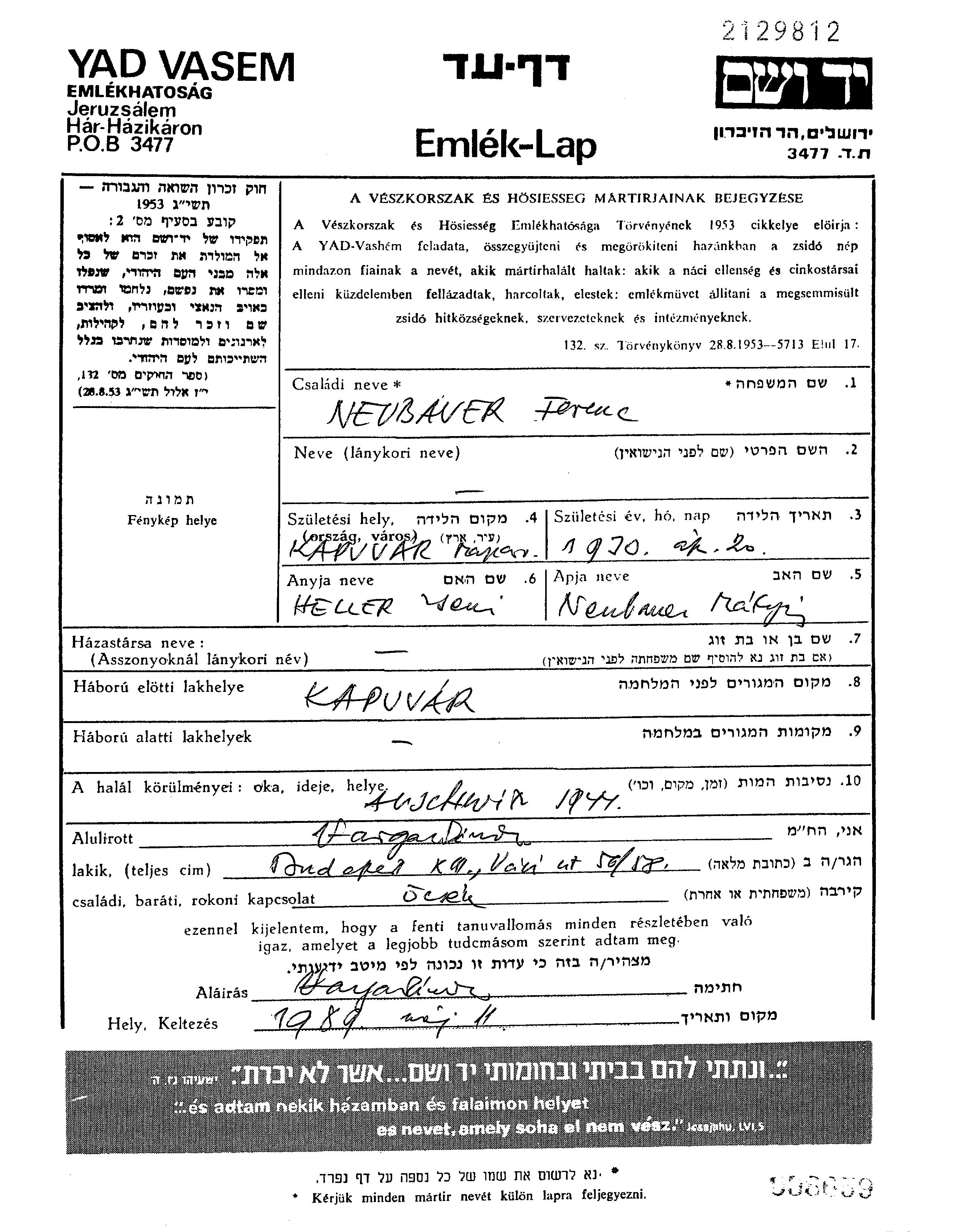 Neubauer Ferentz 1930 Kapuvar, Hungary Page of Testimony