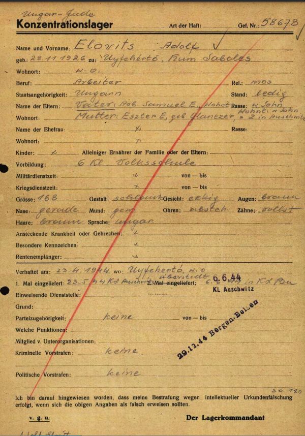 Elovits Adolf 1926 Ujfeherto, Hungary ITS card file