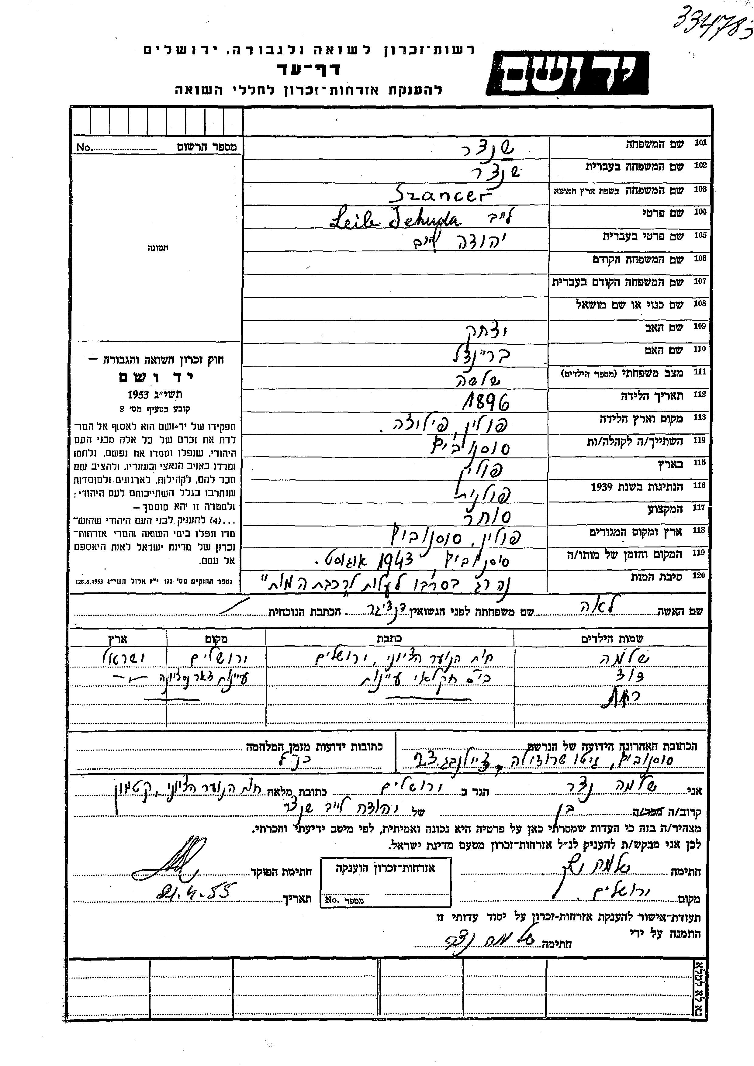 Jehuda Leib Szancer was born in Kielce, Poland, 1896. He was a merchant. Prior to WWII he lived in Sosnowiec, Poland.