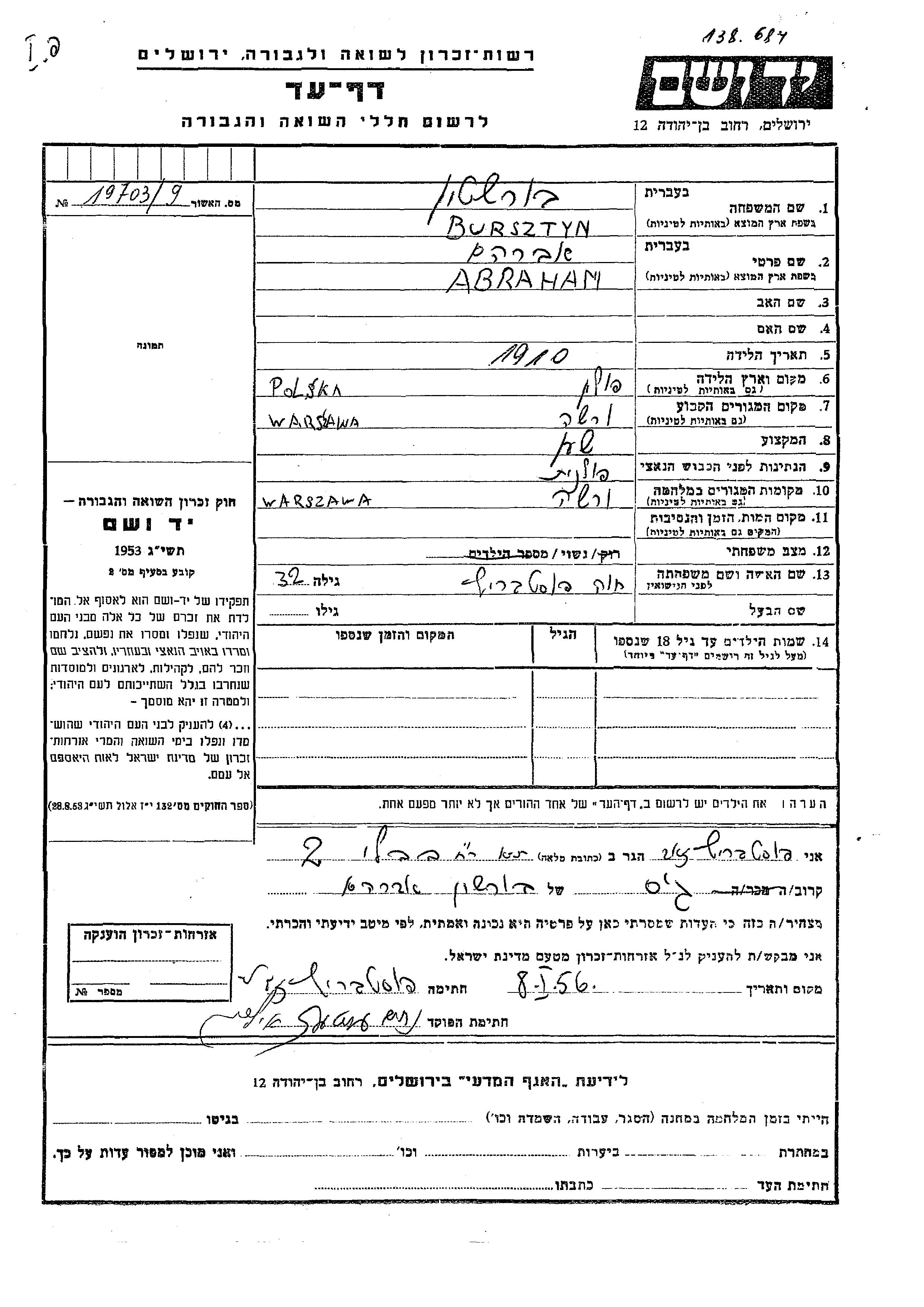 Bursztyn Abraham 1910 Warszawa, Poland Page of Testimony