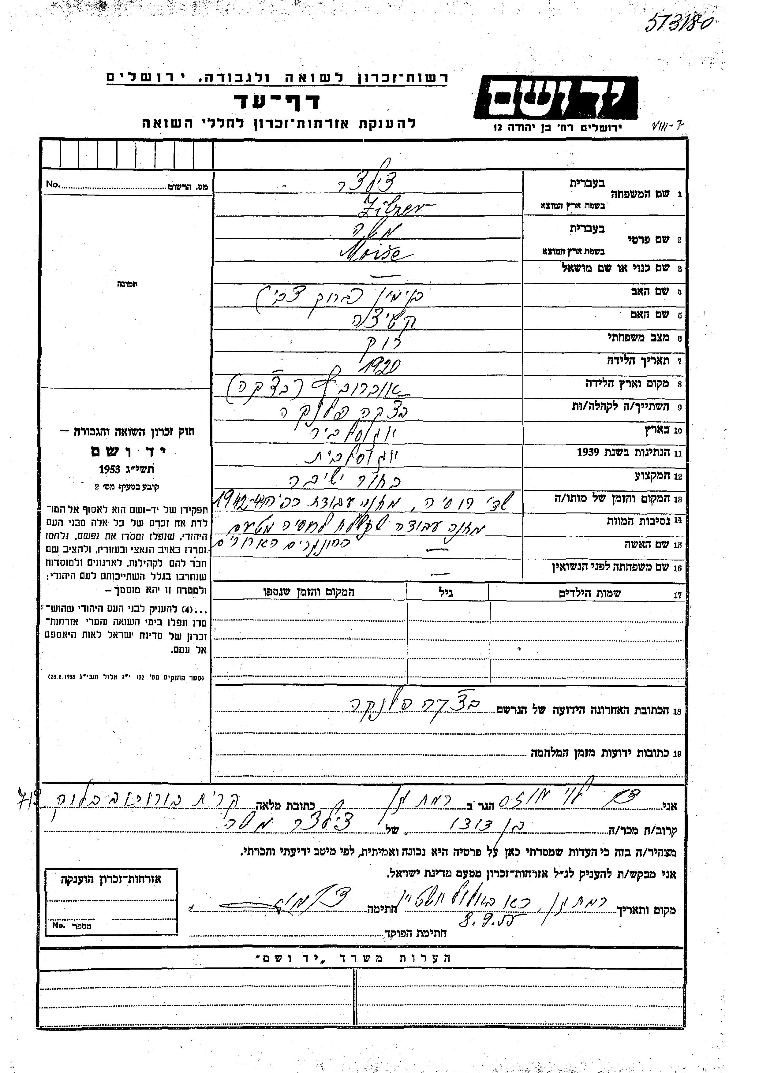 Moise Zilzer Tziltzer was born in Obrovac, Yugoslavia, 1920 to Beniamin Barukh and Katitza. He was a yeshiva student and single. Prior to WWII he lived in Backa Palanka, Yugoslavia. During the war he was in Backa Palanka, Yugoslavia. Moise was murdered in the Shoah. Place of death: Russia (USSR), 1942.