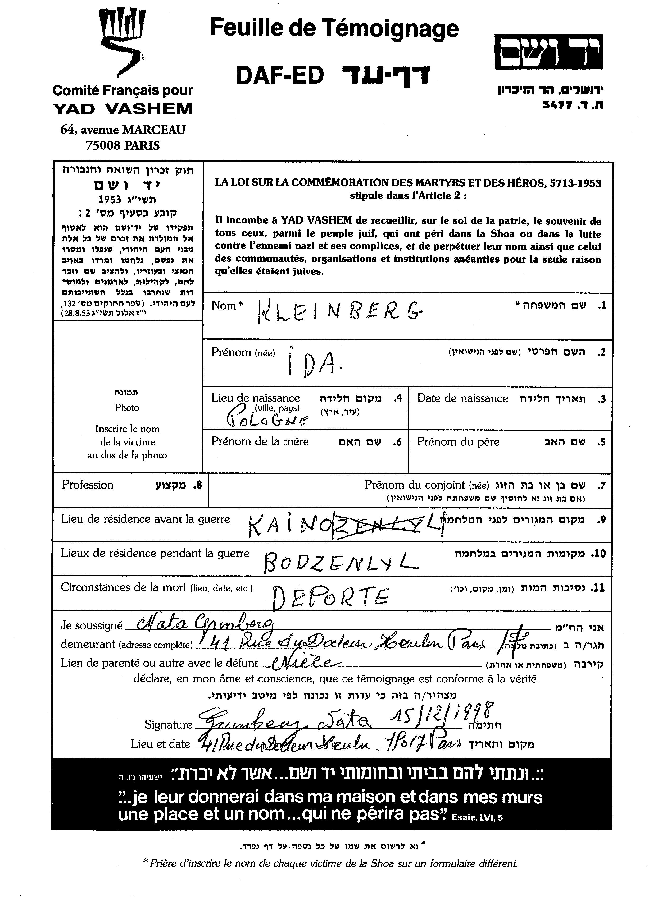 Kleinberg Ida Krajno, Poland Page of Testimony