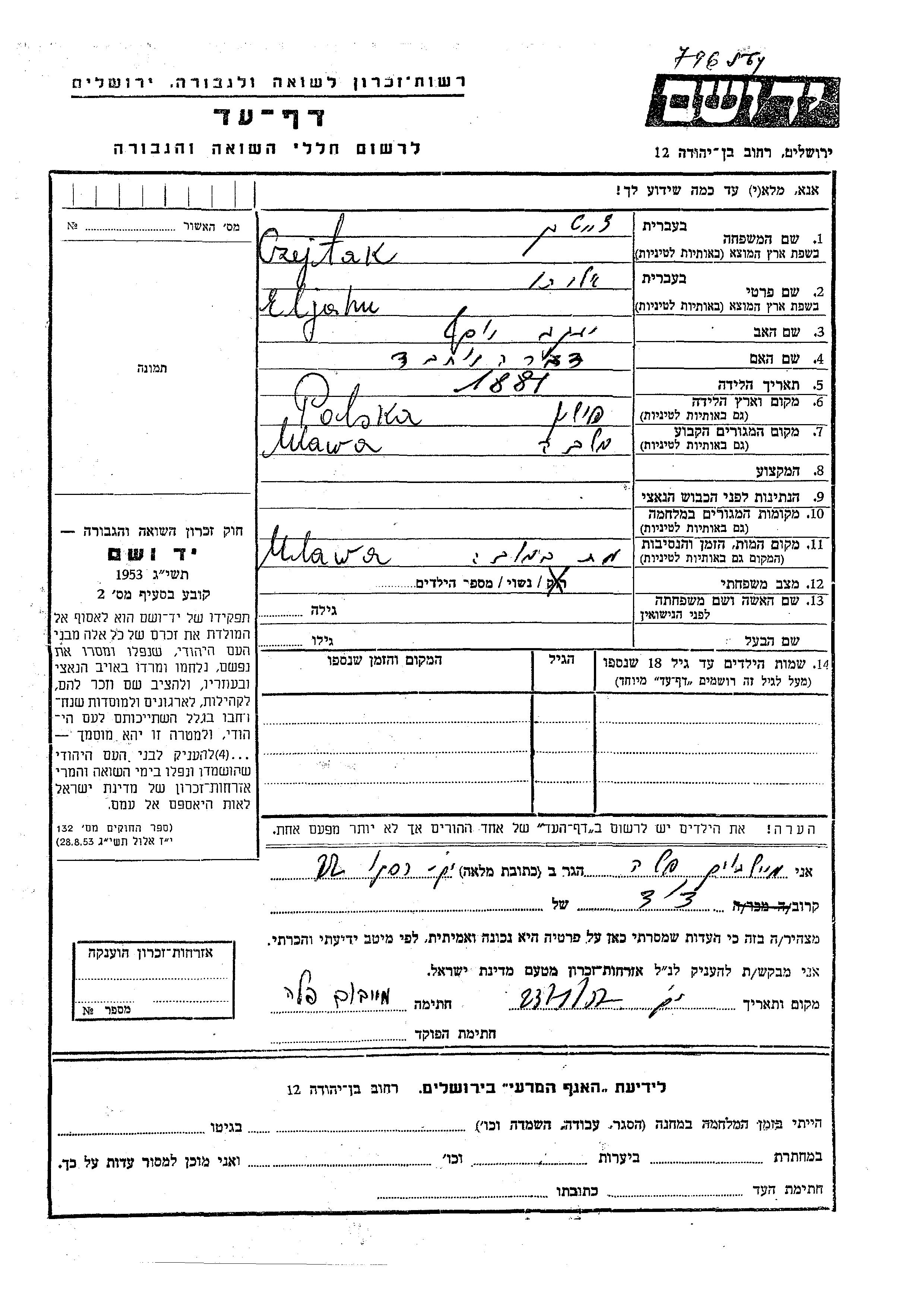 Eljahu was murdered in the Shoah. Place of death: Mlawa, Poland.