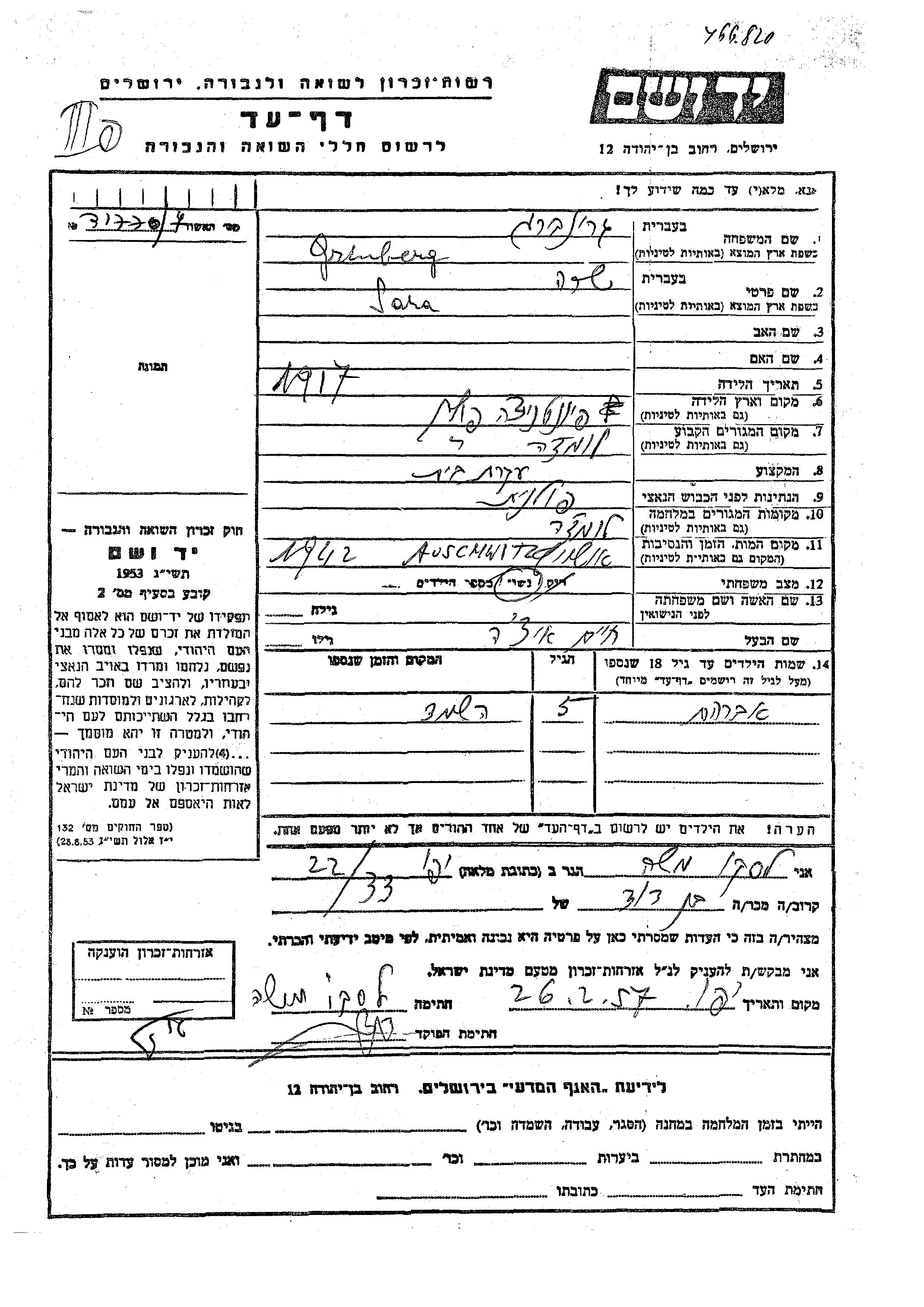 Sara Grinberg was born in Piatnica, Poland, 1917. She was a housewife and married to Khaim Icie. Prior to WWII she lived in Łomża, Poland. During the war she was in Łomża, Poland. Sara was murdered in the Shoah. Place of death: Auschwitz, Poland, 1942.
