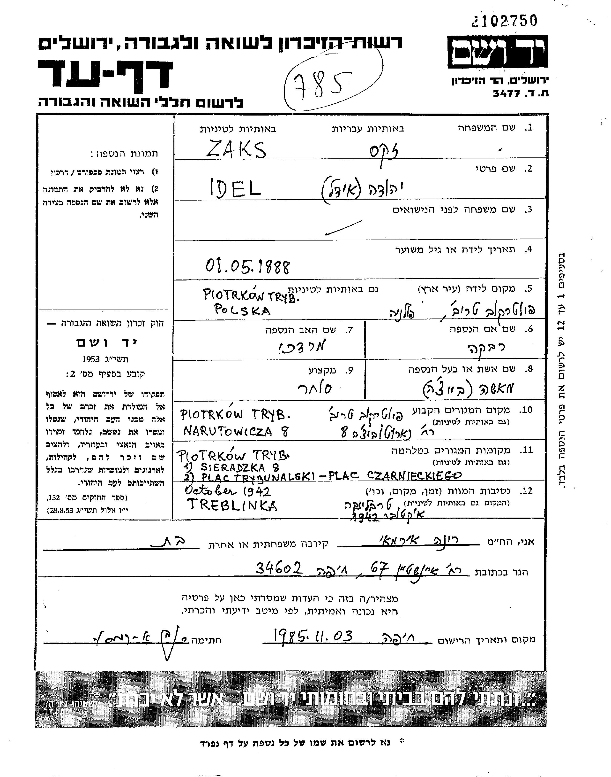 Zaks Idel 1888 Piotrkow, Poland Page of Testimony