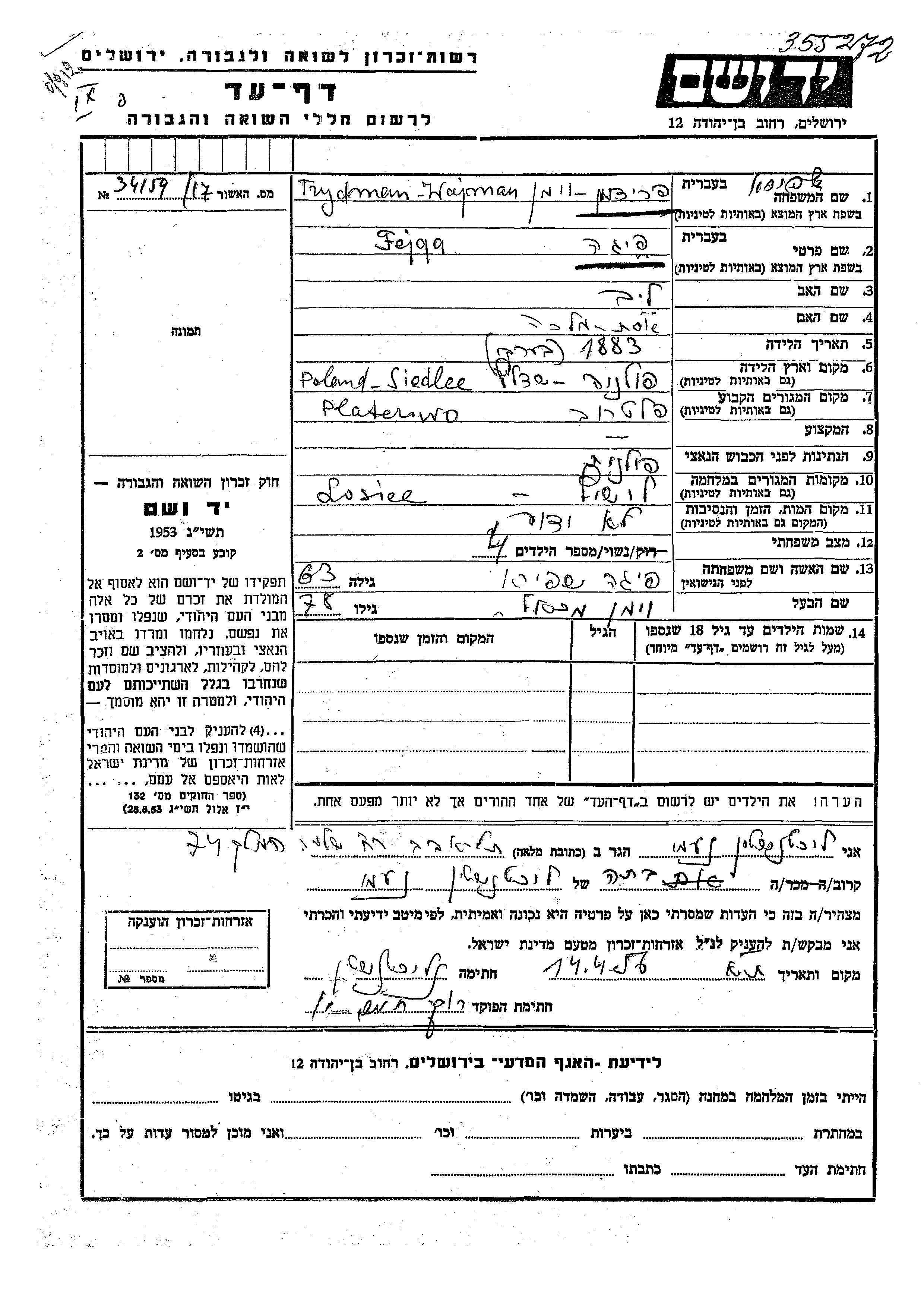 Feiga Wajman Fridman nee Shapira was born in Siedlce, Poland, 1883. Prior to WWII she lived in Siedlce, Poland. Feiga was murdered in the Shoah. Place of death: Losice, Poland, 1943.
