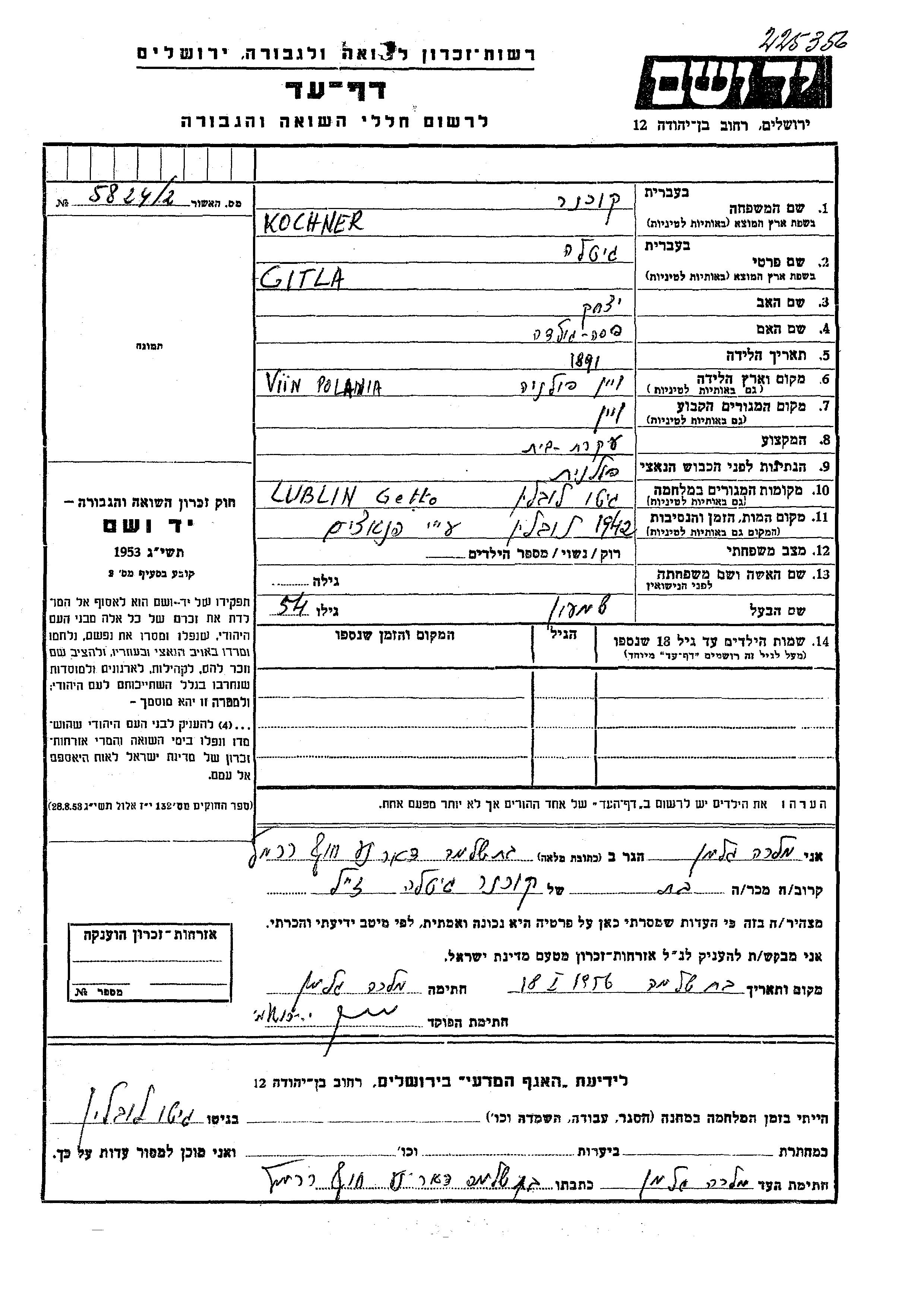 Gitla Kochner was born in Wien, Austria, 1891 to Yitzkhak and Pesa Golda. She was a housewife. Prior to WWII she lived in Wien, Austria. During the war she was in Lublin, Poland.
