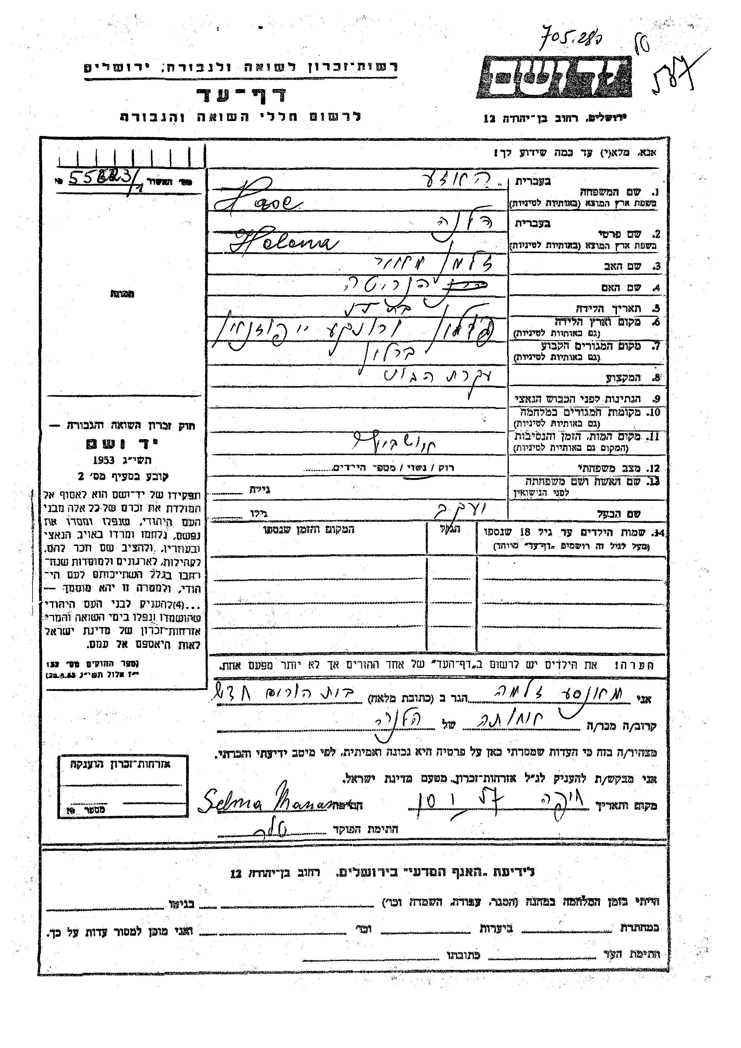 Helena Hase was born in Wronki, Poland to Zalman Meir and Henrieta. She was a housewife and married to Yaakov. Prior to WWII she lived in Berlin, Germany. Helena was murdered in the Shoah. Place of death: Auschwitz, Poland.
