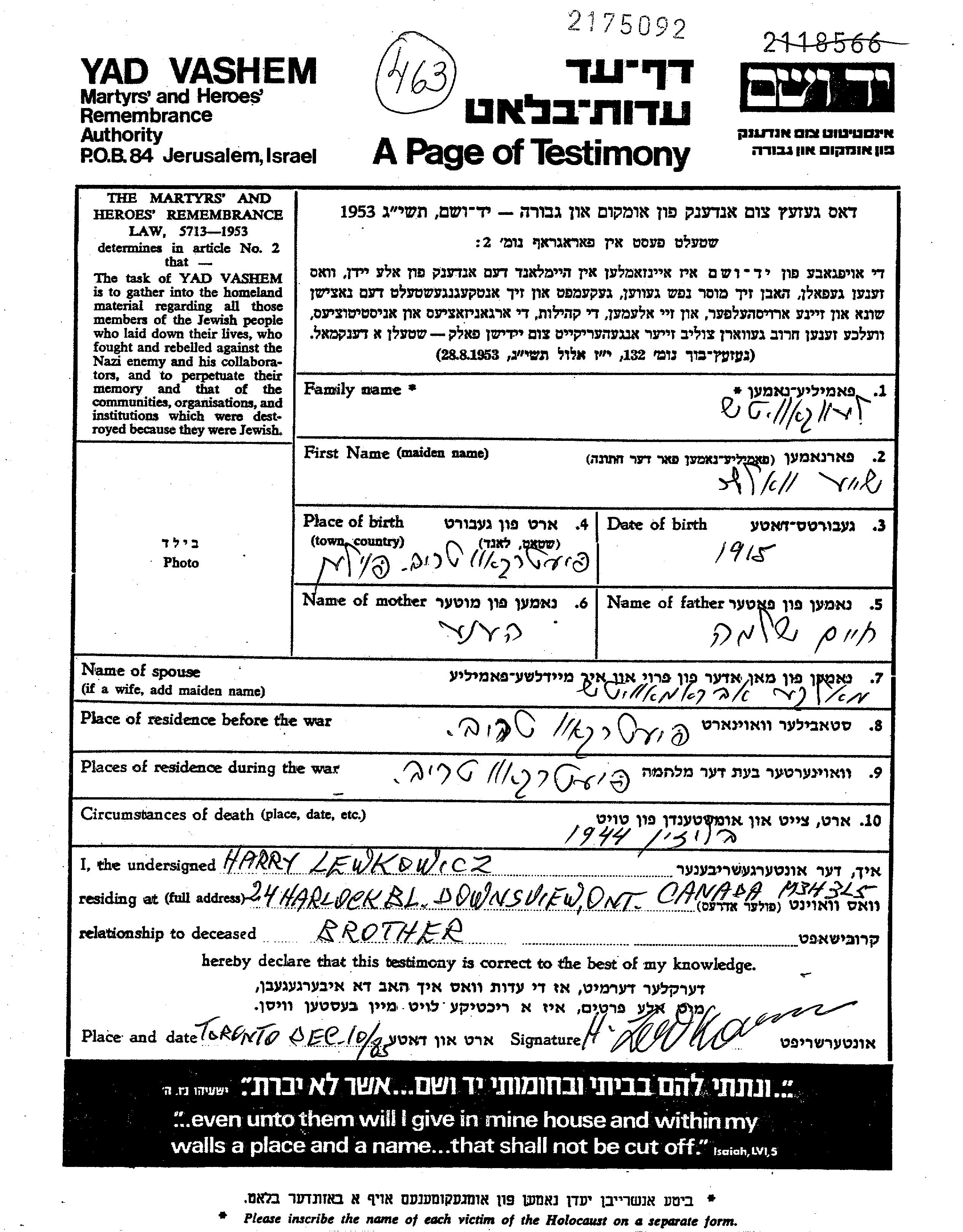 Lewkowicz Szaja Wolf Sheya 1915 Piotrkow, Poland Page of Testimony