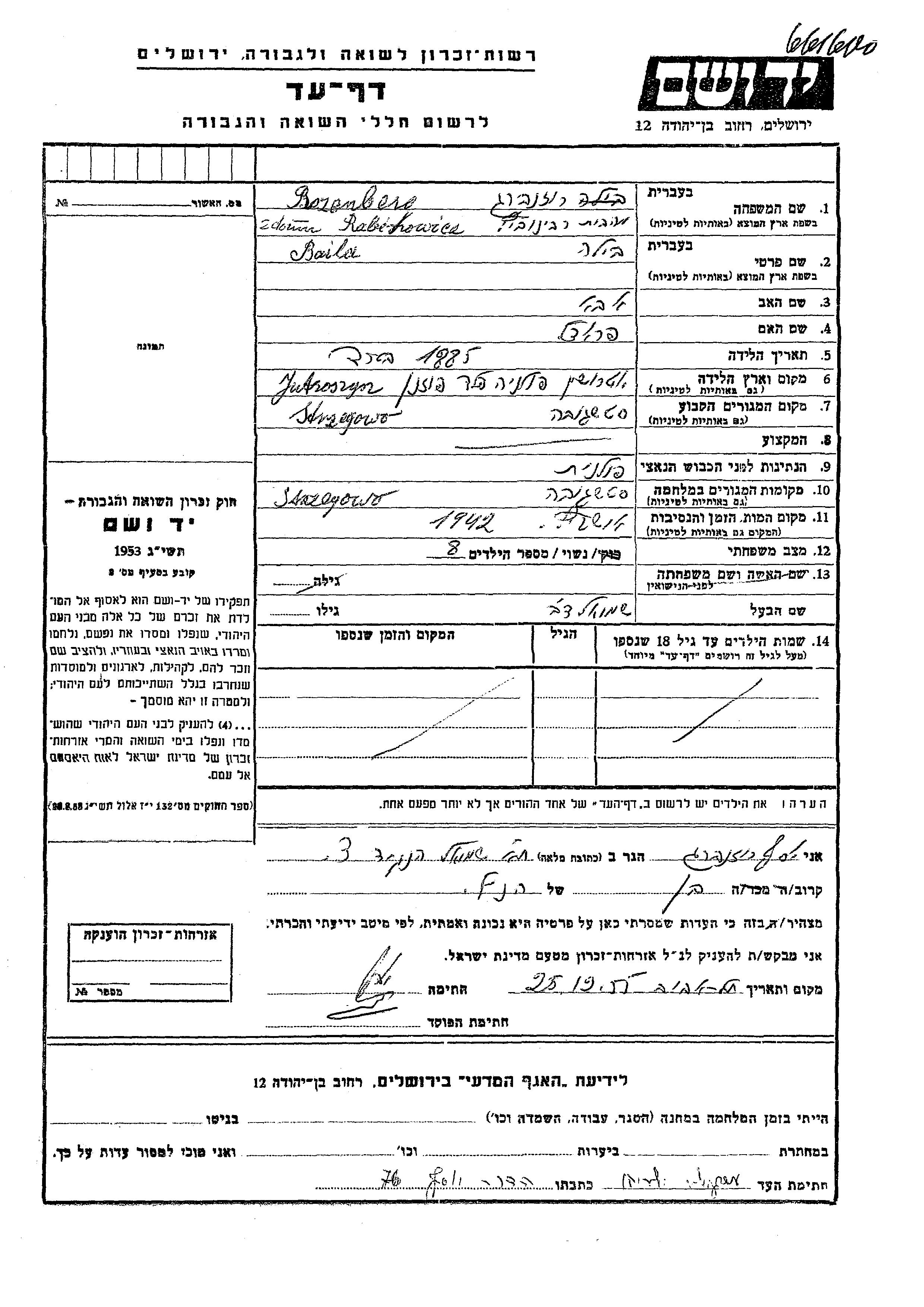 Baila Rozenberg nee Rabinowicz was born in Jutrosin, Poland, 1885 to Aba and Fradel. She was married to Shmuel Dov. Prior to WWII she lived in Strzegowo, Poland. During the war she was in Strzegowo, Poland. Baila was murdered in the Shoah. Place of death: Auschwitz, Poland, 1942.