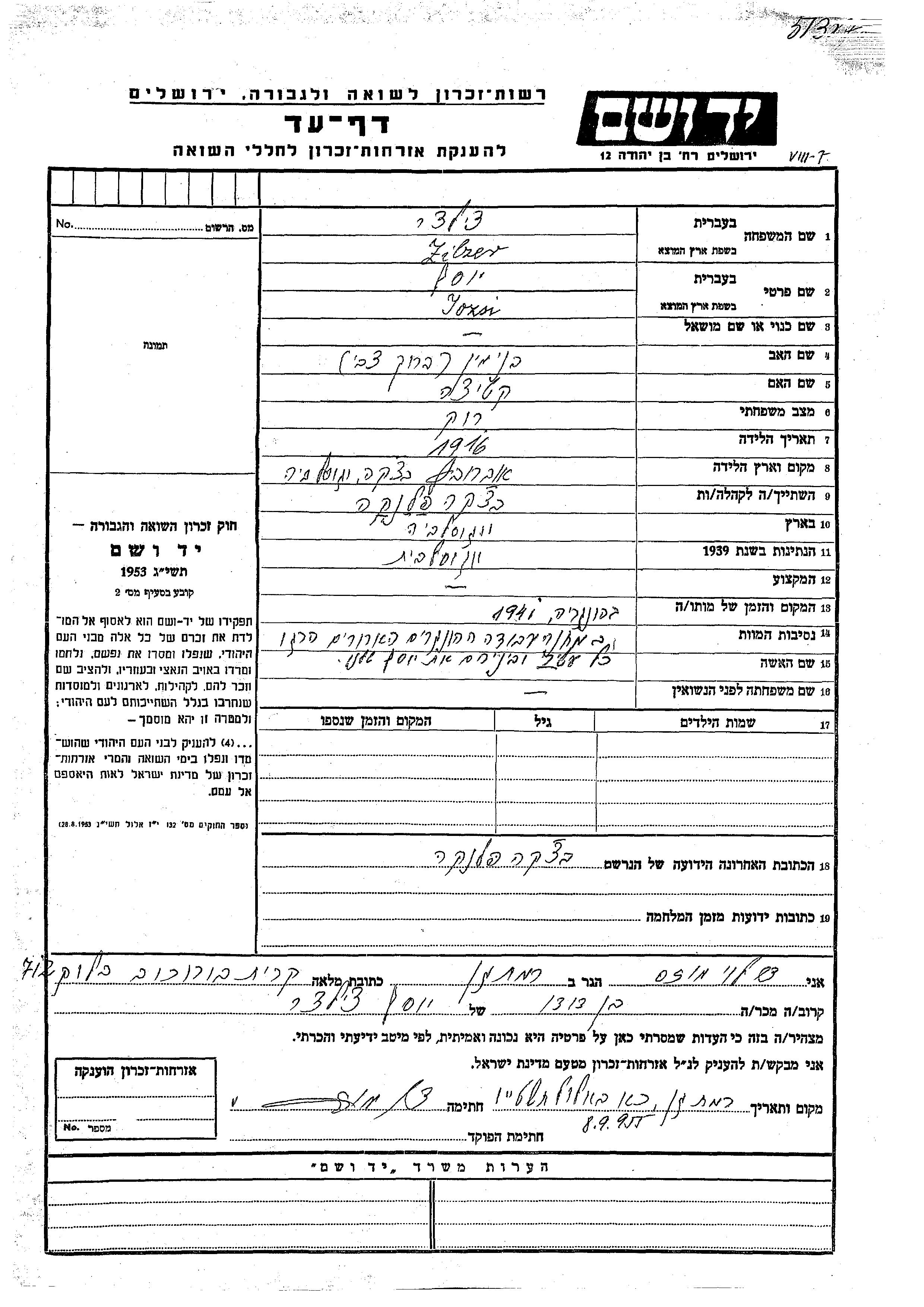 Yozsi Zilzer Tziltzer was born in Bacska, Hungary, 1916 to Beniamin Barukh and Katitza. He was single. Prior to WWII he lived in Backa Palanka, Yugoslavia. Yozsi was murdered in the Shoah. Place of death: Hungary, 1941.