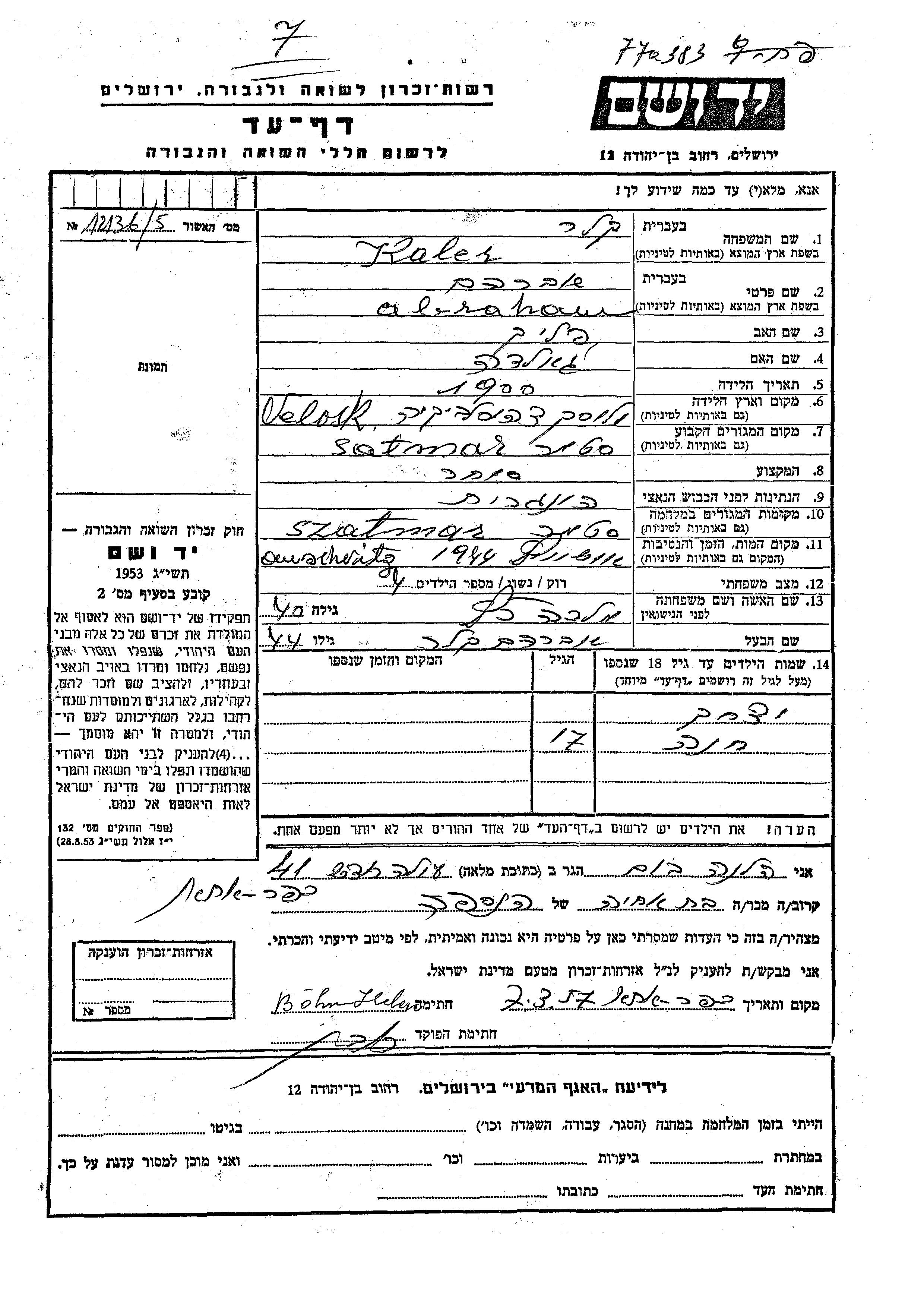 Kaler Keler Abraham 1900 Satmar, Romania Page of Testimony