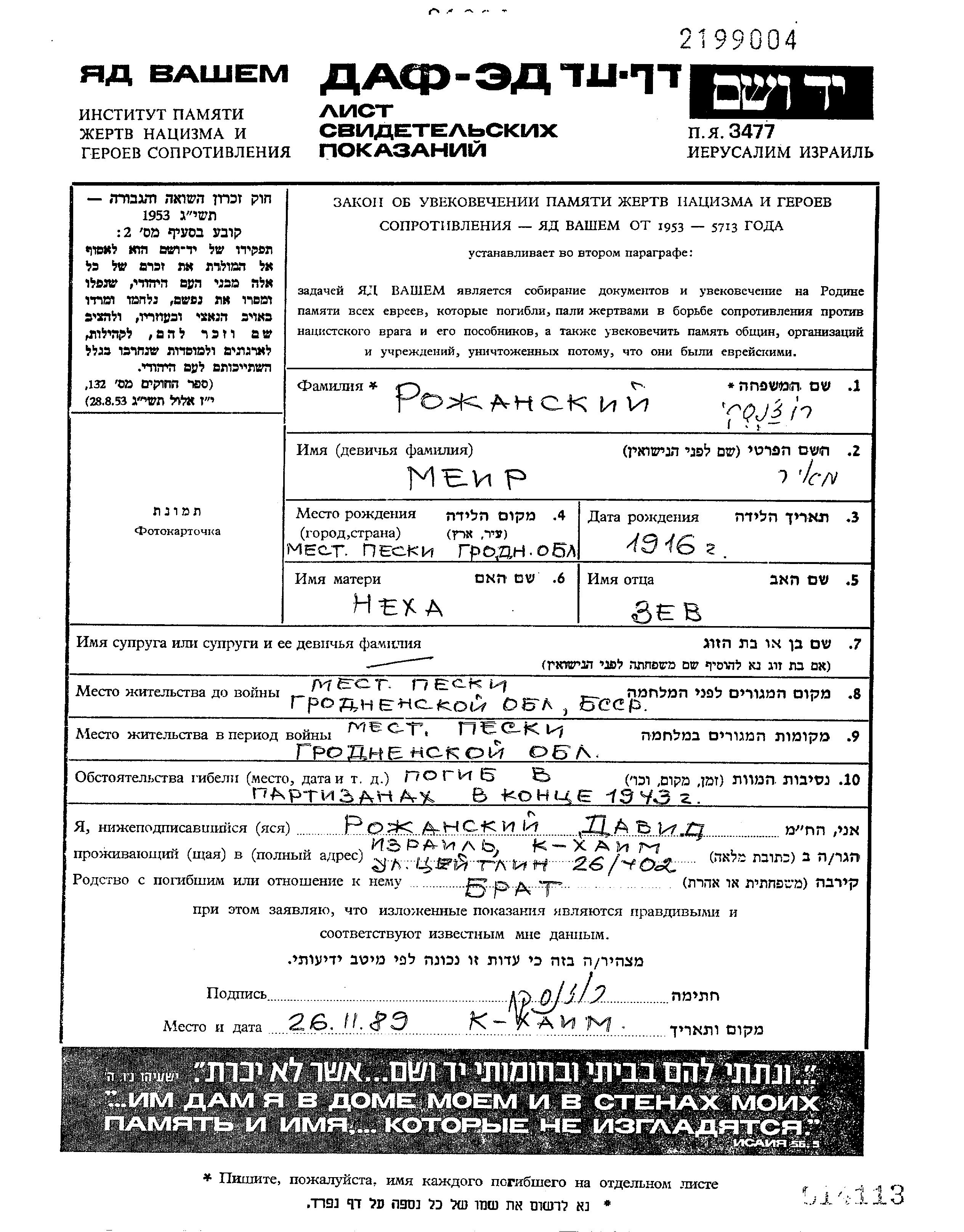 Rozhanski | Meir | 1916 | Piaski, Poland | Page of Testimony |