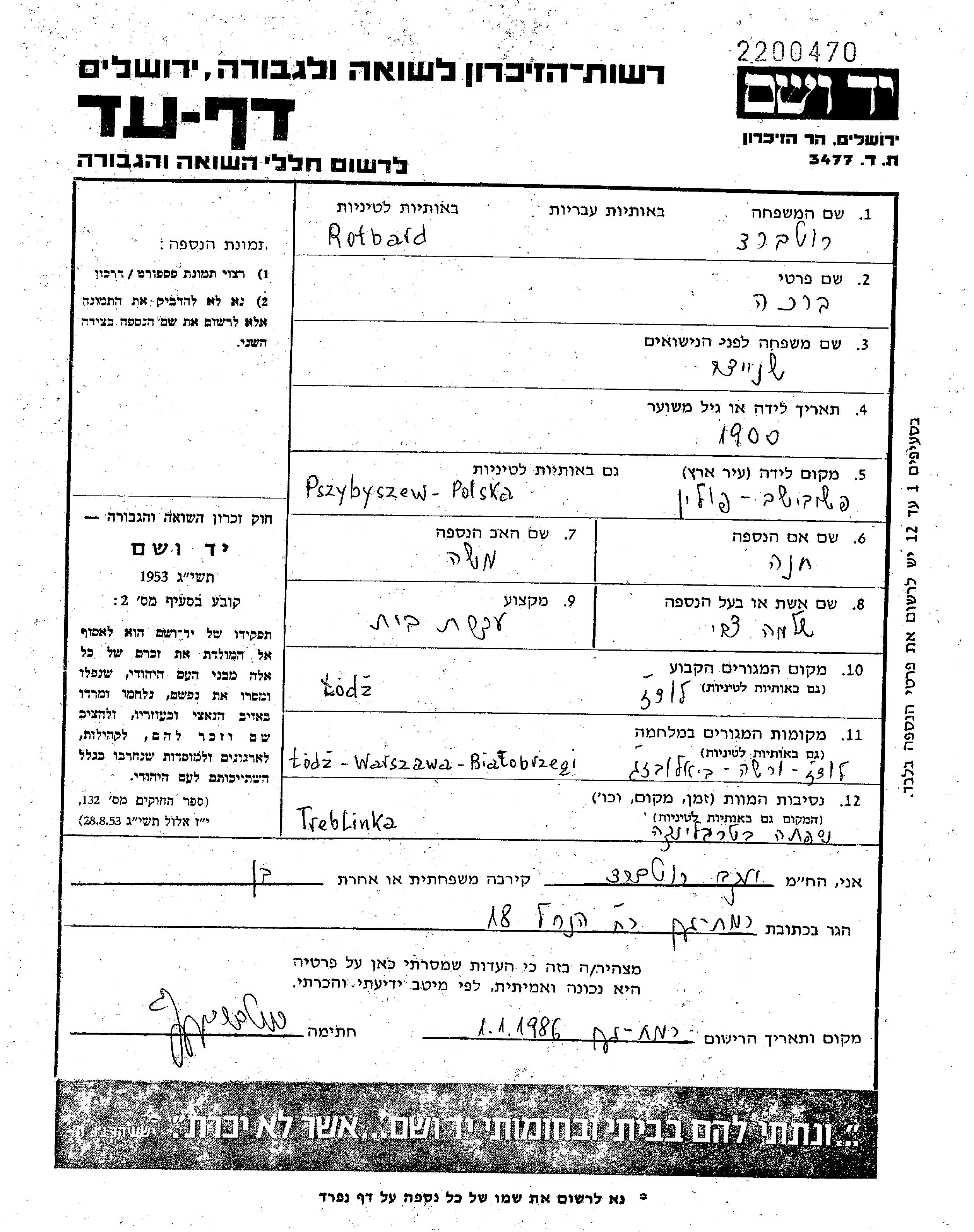 Bracha Rotbard nee Shnaider was born in Grojec, Poland, 1900. She was a housewife. Prior to WWII she lived in Lodz, Poland. Bracha was murdered in the Shoah. Place of death: Treblinka, Poland, 26/09/1942.