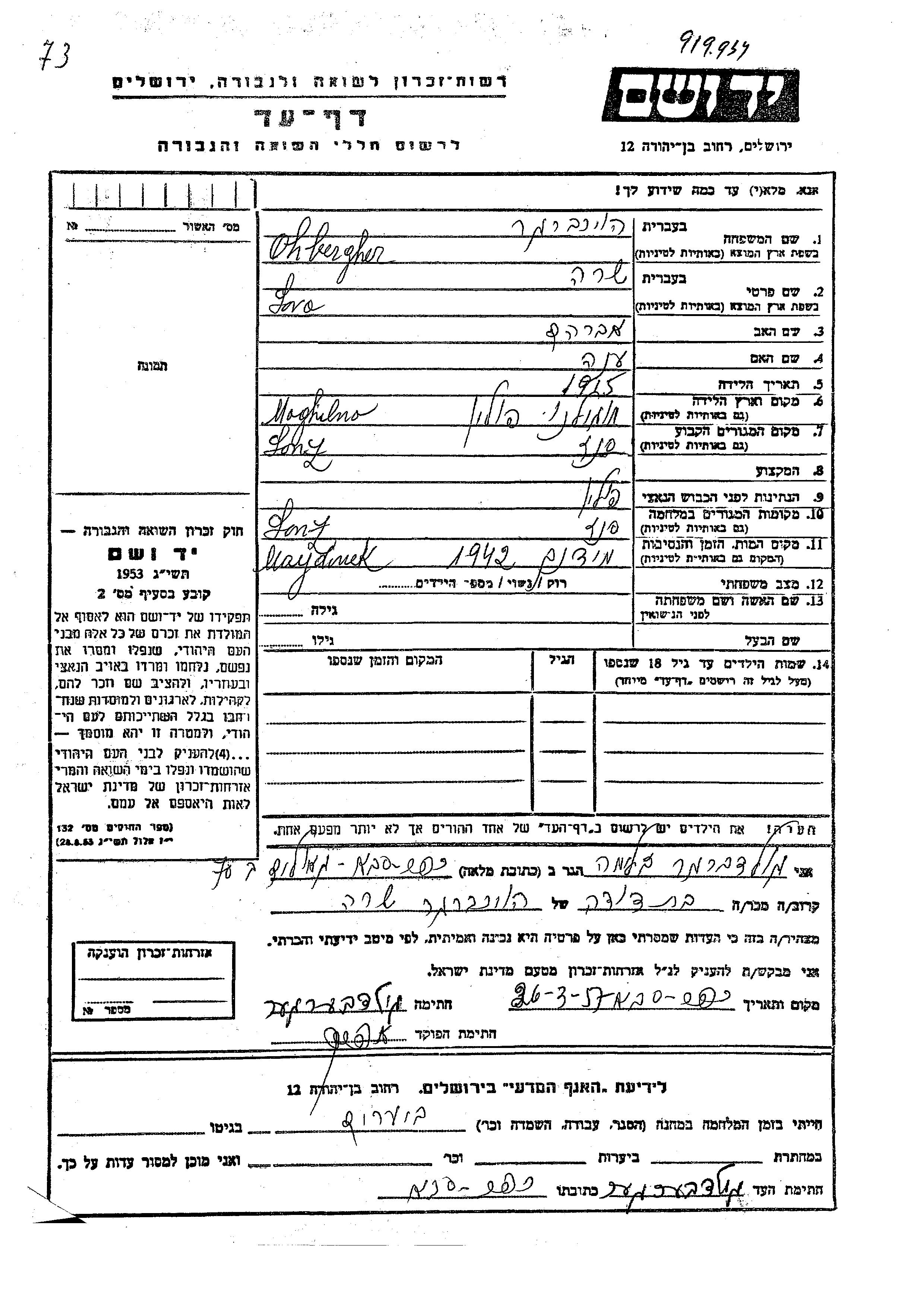 Sara Ohbergher was born in Mogilno, Poland, 1915 to Avraham and Ena. Prior to WWII she lived in Sanz, Poland. During the war she was in Sanz, Poland. Sara was murdered in the Shoah. Place of death: Majdanek, Poland, 1942.