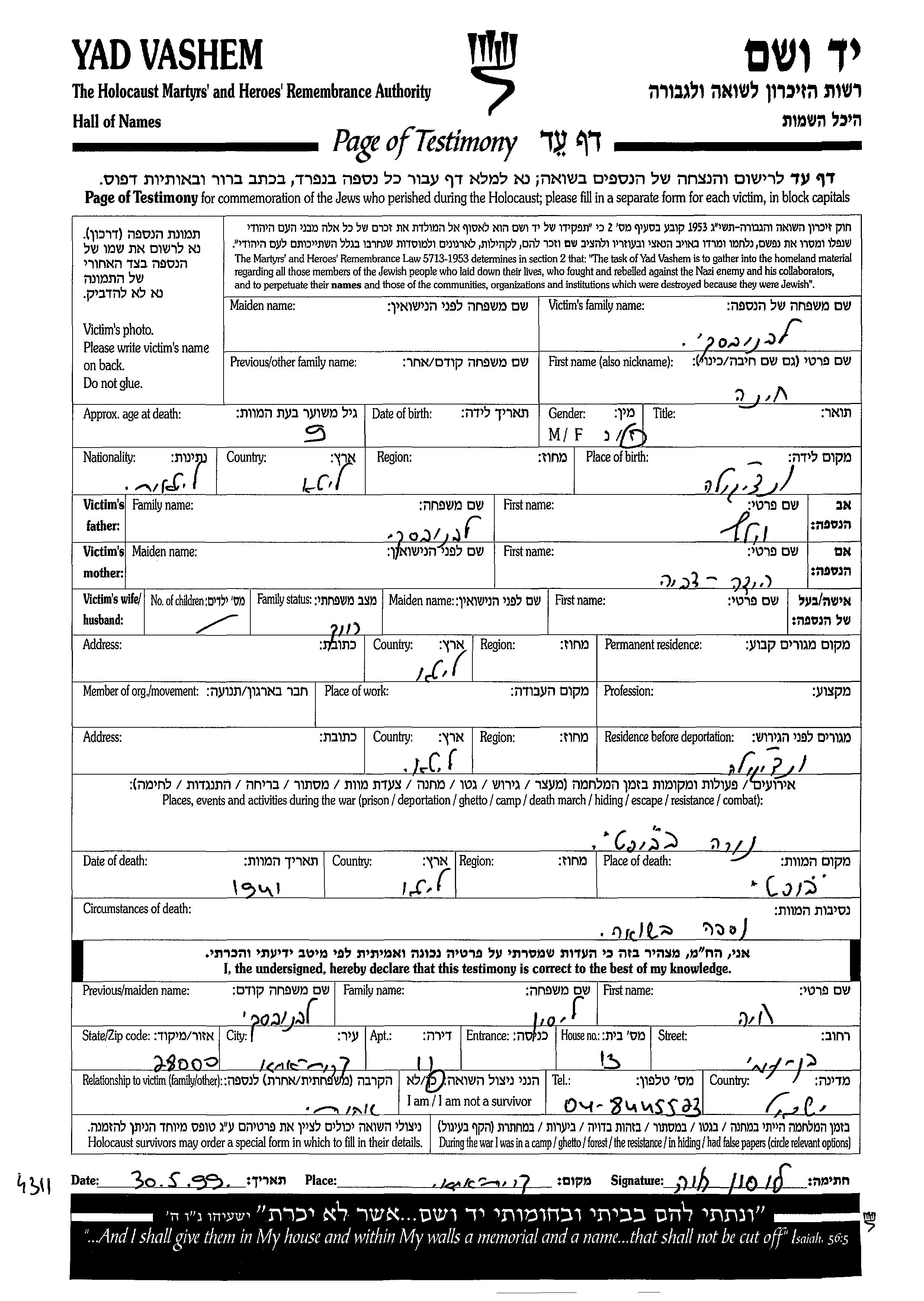 | Levanovski Lison | Khaia | unstated place, | Page of Testimony | |