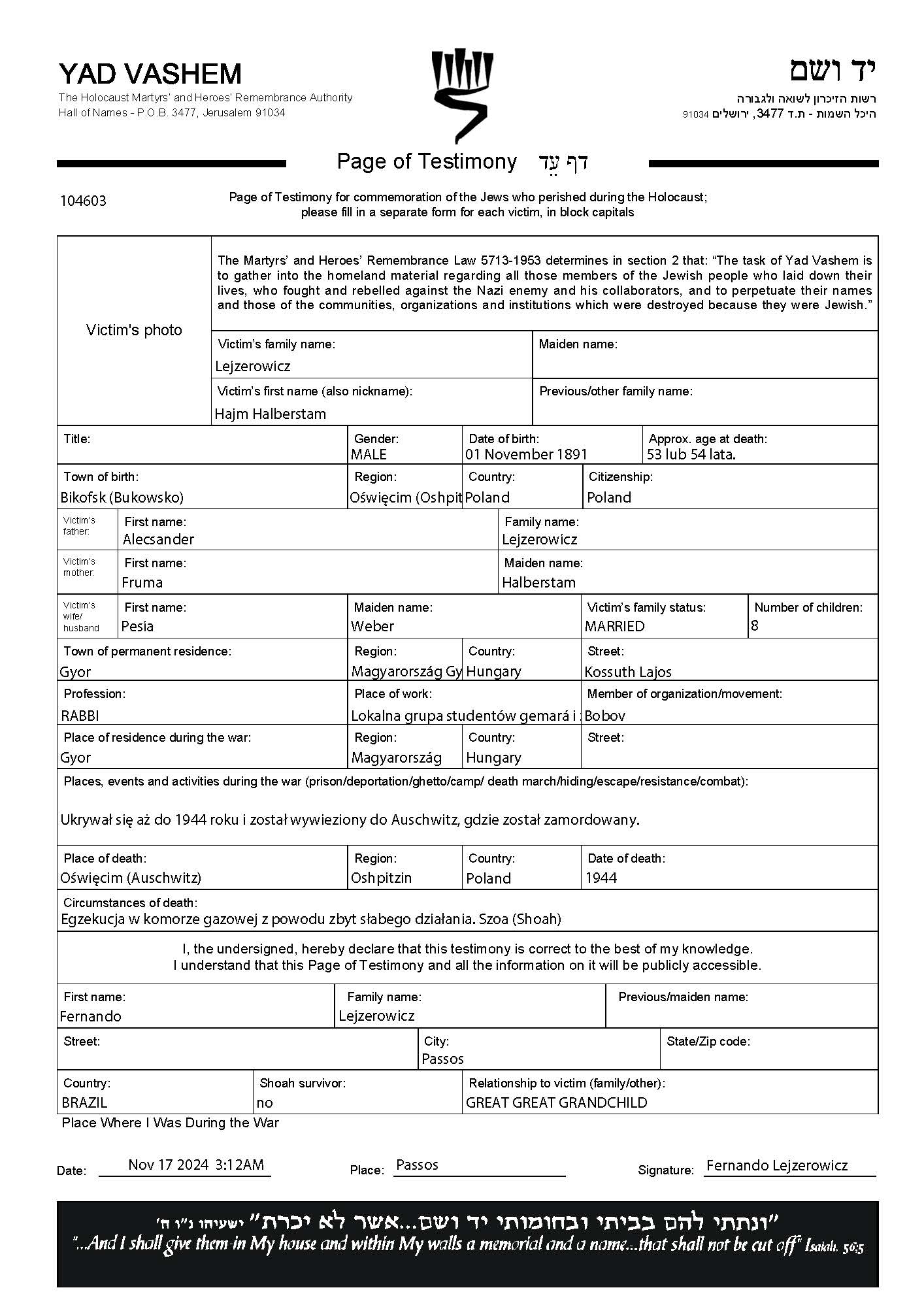 Lejzerowicz Hajm 1891 Gyor, Hungary Page of Testimony (digital)