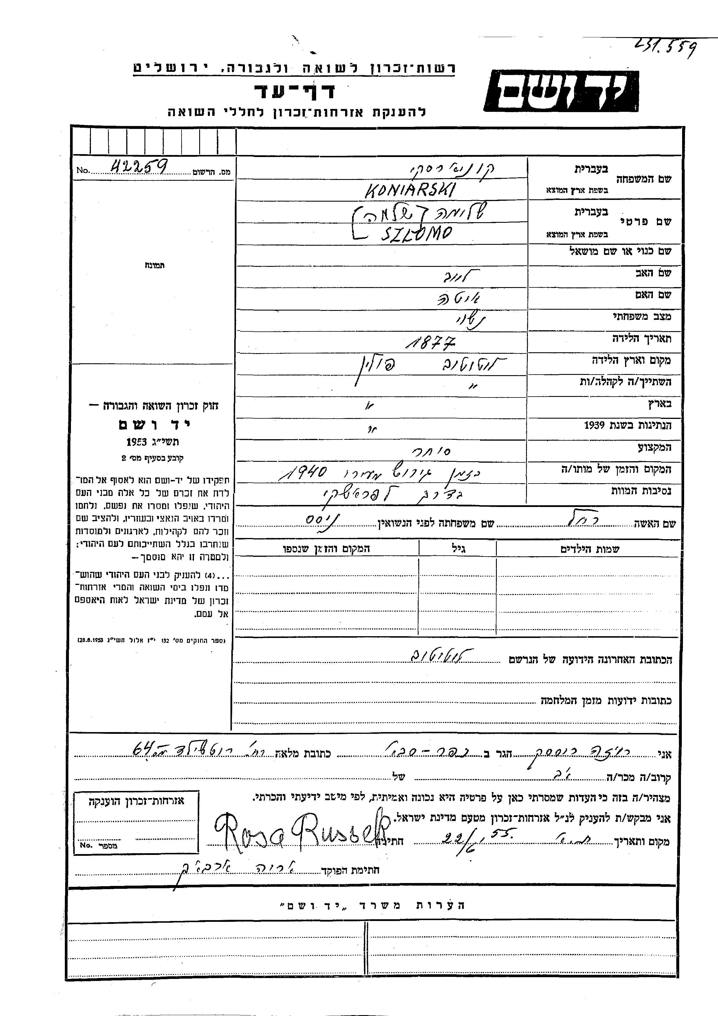 Koniarski Szlomo 1877 unstated place, Page of Testimony