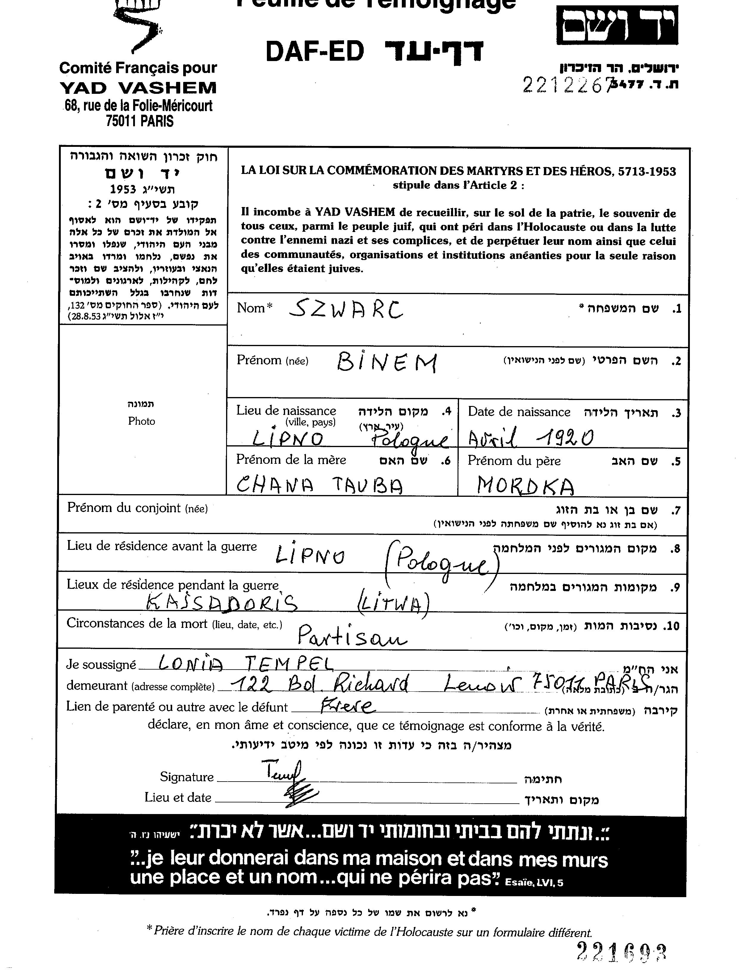 Szwarc Binem 1920 Lipno, Poland Page of Testimony