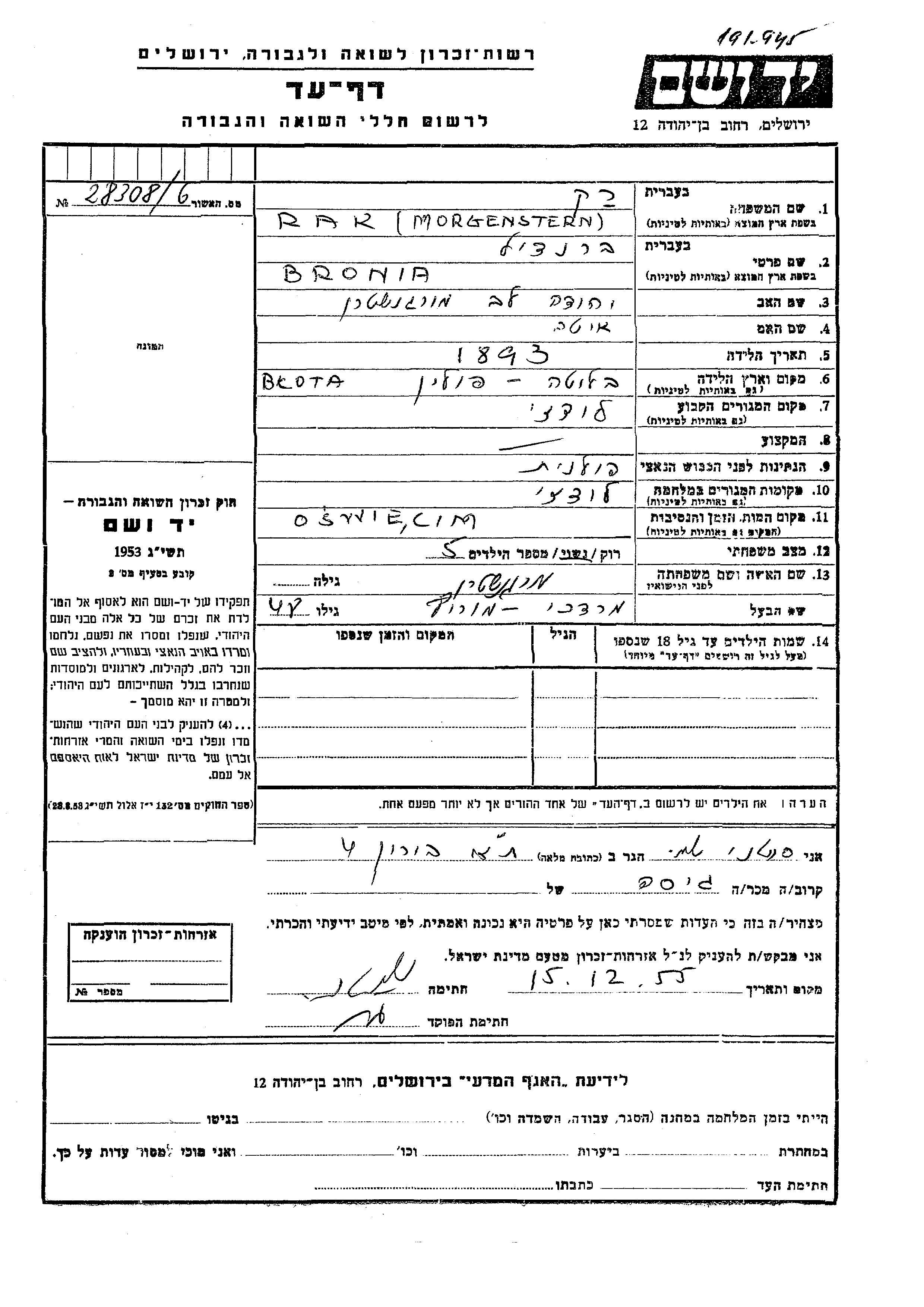Bronia Brandil Rak nee Morgenstern was born in Blota, Poland, 1893 to Yehuda Lev and Ita. She was married to Mordekhai Moritz. Prior to WWII she lived in Lodz, Poland. During the war she was in Lodz, Poland.