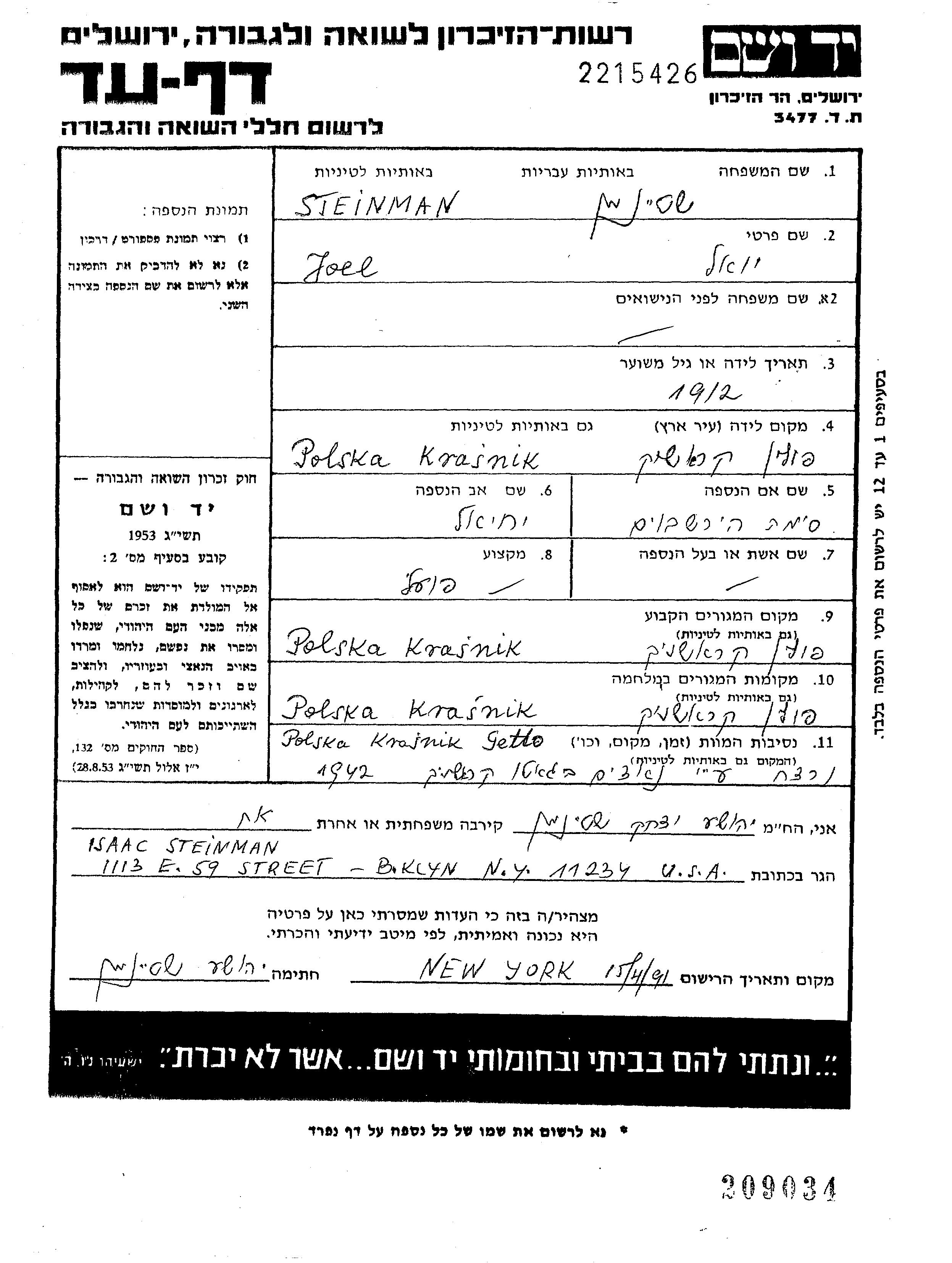 | Steinman | Joel | 1912 | Kraśnik, Poland | Page of Testimony |