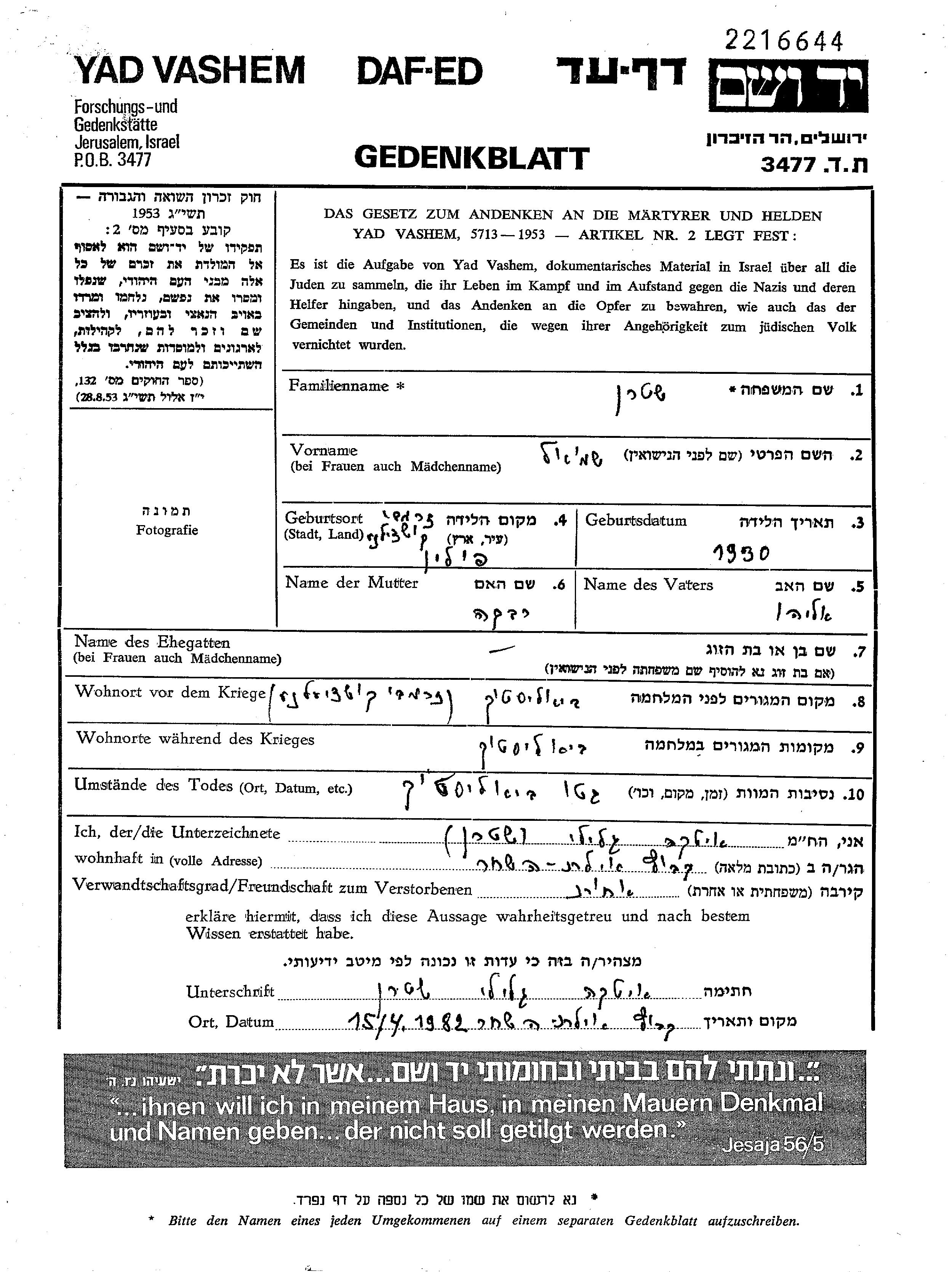 Shmuel Leizer Sztern was born in Ostrów Mazowiecka, Poland, 1930. He was a pupil. Prior to WWII he lived in Bialystok, Poland. Shmuel Leizer was murdered in the Shoah. Place of death: Bialystok, Poland.