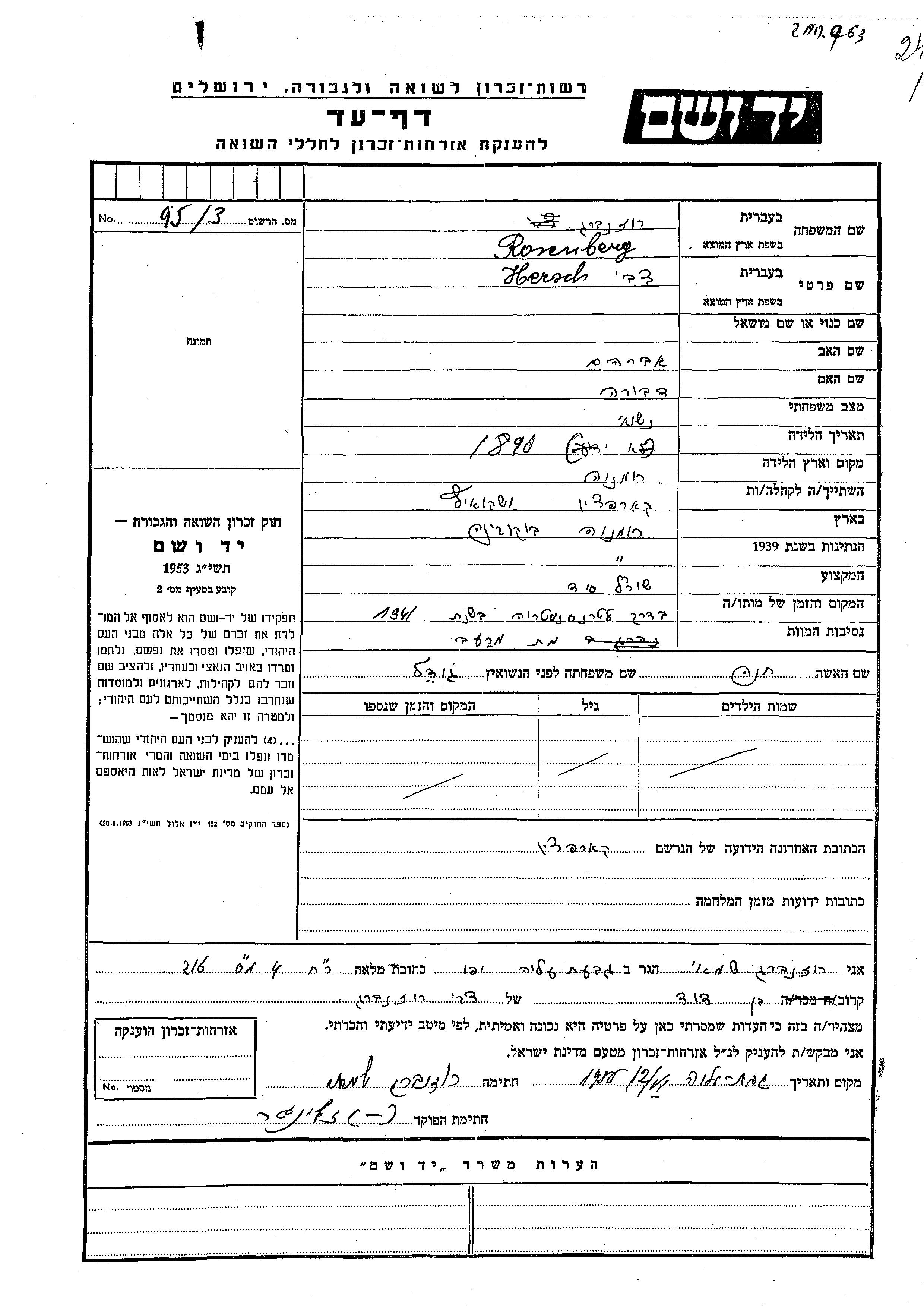 Hersch Tzvi Rosenberg was born in Romania, 1890 to Avraham and Dvora. He was a lime factory and married to Khana nee Godel. Prior to WWII he lived in Karpachi, Belorussia (USSR). During the war he was in Karpachi, Belorussia (USSR). Hersch Tzvi was murdered in the Shoah. Place of death: Transnistria, Ukraine (USSR), 1941.