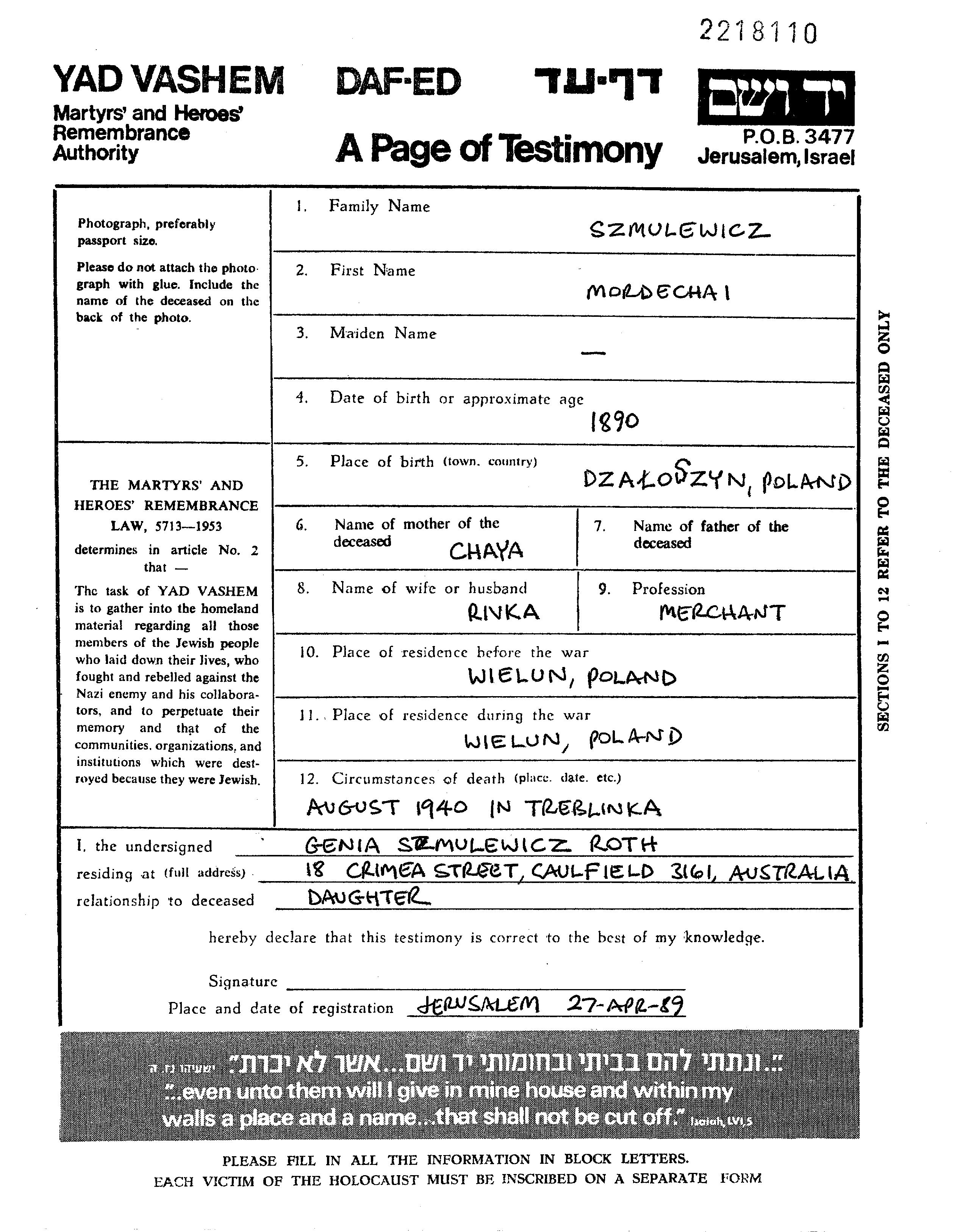 Szmulewicz Mordechai 1890 Wielun, Poland Page of Testimony