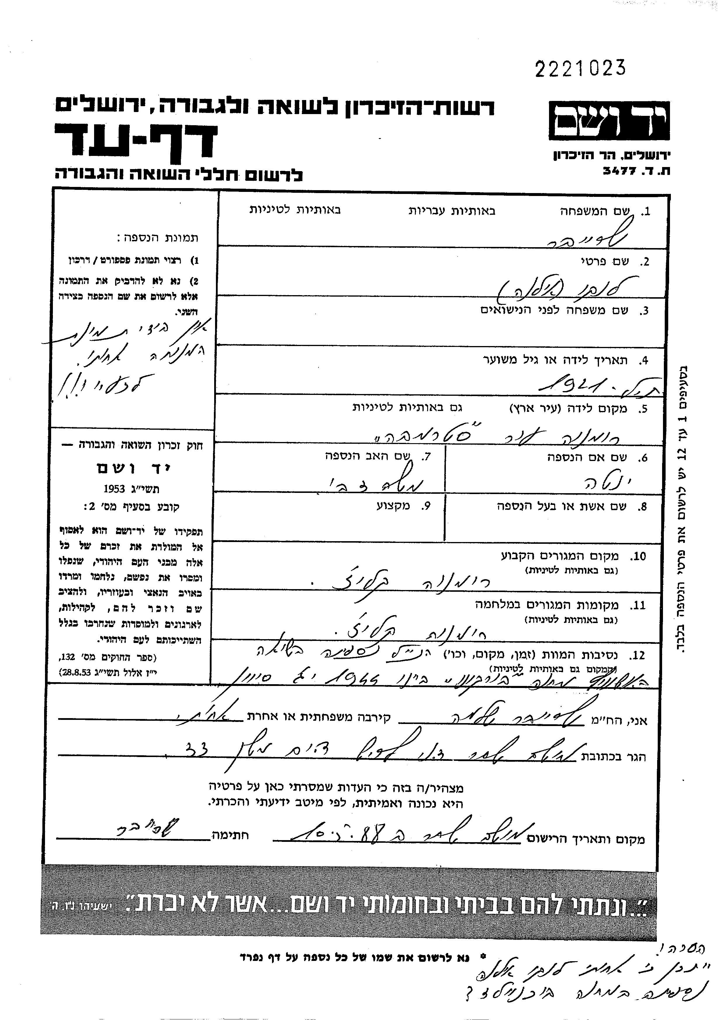 Yad Vashem - Pages of Testimony Names Memorial Collection